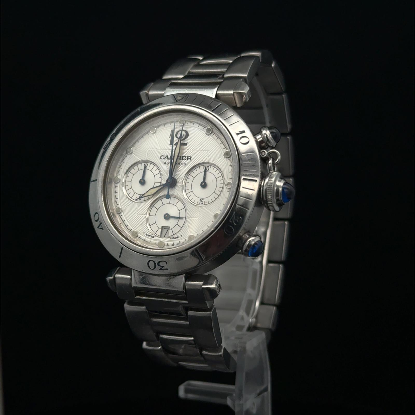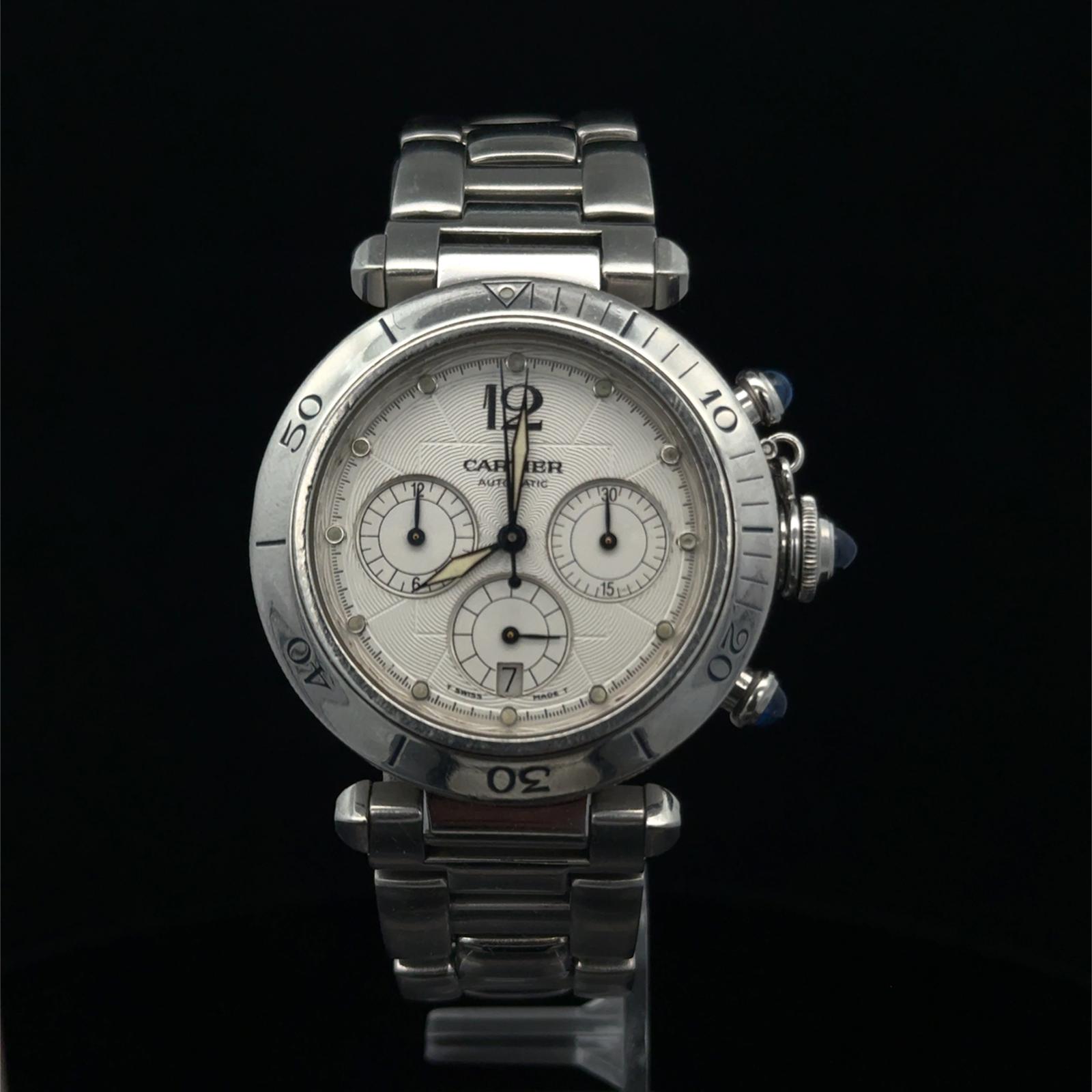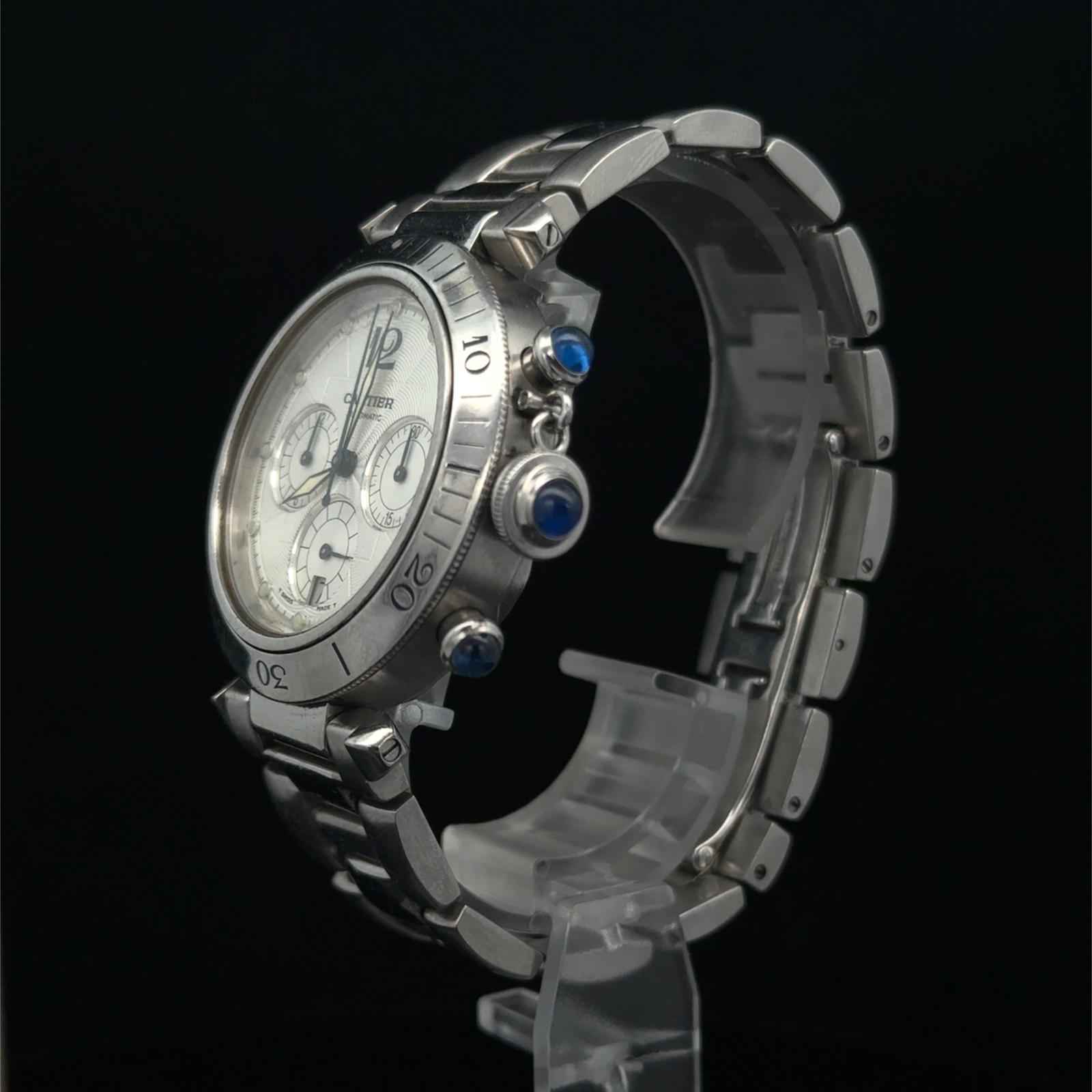 Marca Cartier Modello (Orologio) Pasha Numero di referenza 2113 Carica Automatico Materiale della cassa Acciaio Materiale cinturino Acciaio Anno di produzione Non disponibile Condizione Ottimo (di seconda mano, segni di usura assenti o appena visibili) Corredo Con scatola originale e documenti originali Calibro Carica Automatico Cassa Materiale della cassa Acciaio Diametro 38 mm Impermeabile 3 ATM Materiale lunetta Acciaio Vetro Vetro zaffiro Quadrante Argento Cinturino Materiale cinturino Acciaio Colore cinturino Acciaio Chiusura Déployante Materiale chiusura Acciaio Funzioni Cronografo, Data