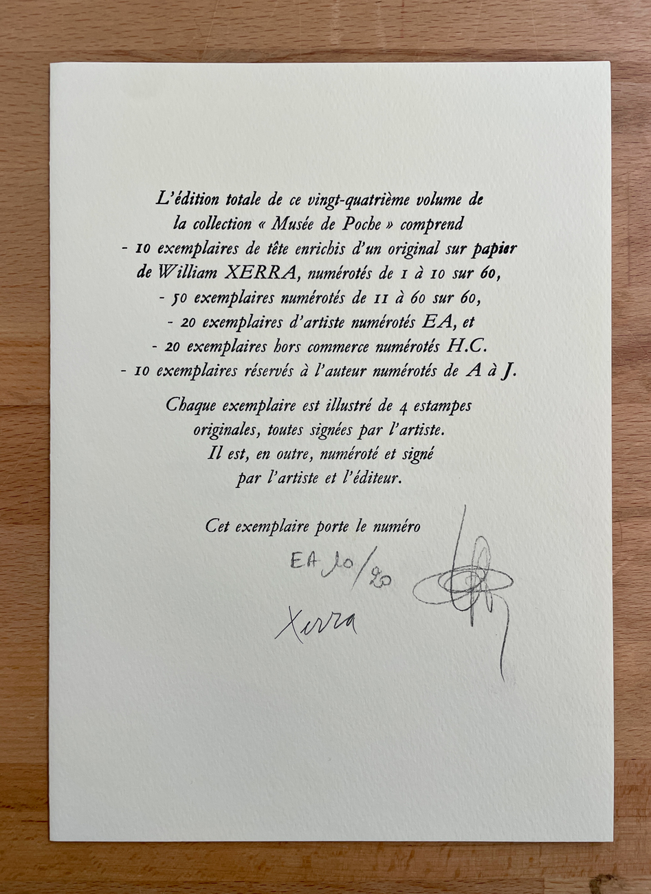 Catalogo riccamente illustrato con testi di Paul Evangelisti, contenente 4 illustrazioni originali realizzate in serigrafia con applicazioni di William Xerra, ciascuna recante firma al fronte, edito per la collana 'Musée de Poche'