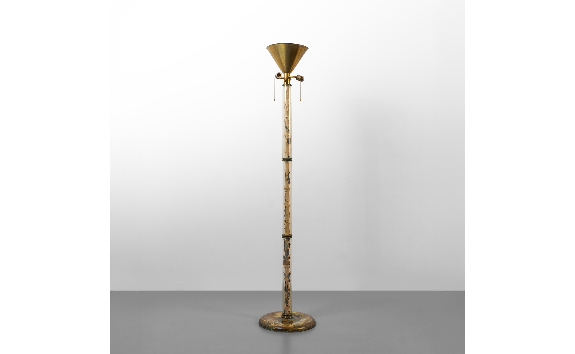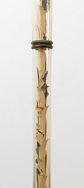 Ottone stelo in cristallo e decoro interno con foglie in metallo sbalzato verniciato.
