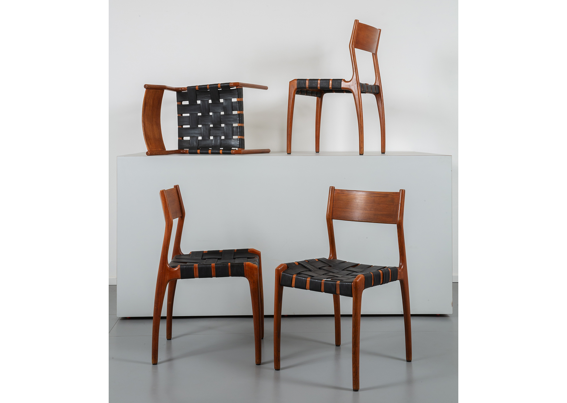 Legno di rovere sedute in fasce di vinilpelle intrecciata.