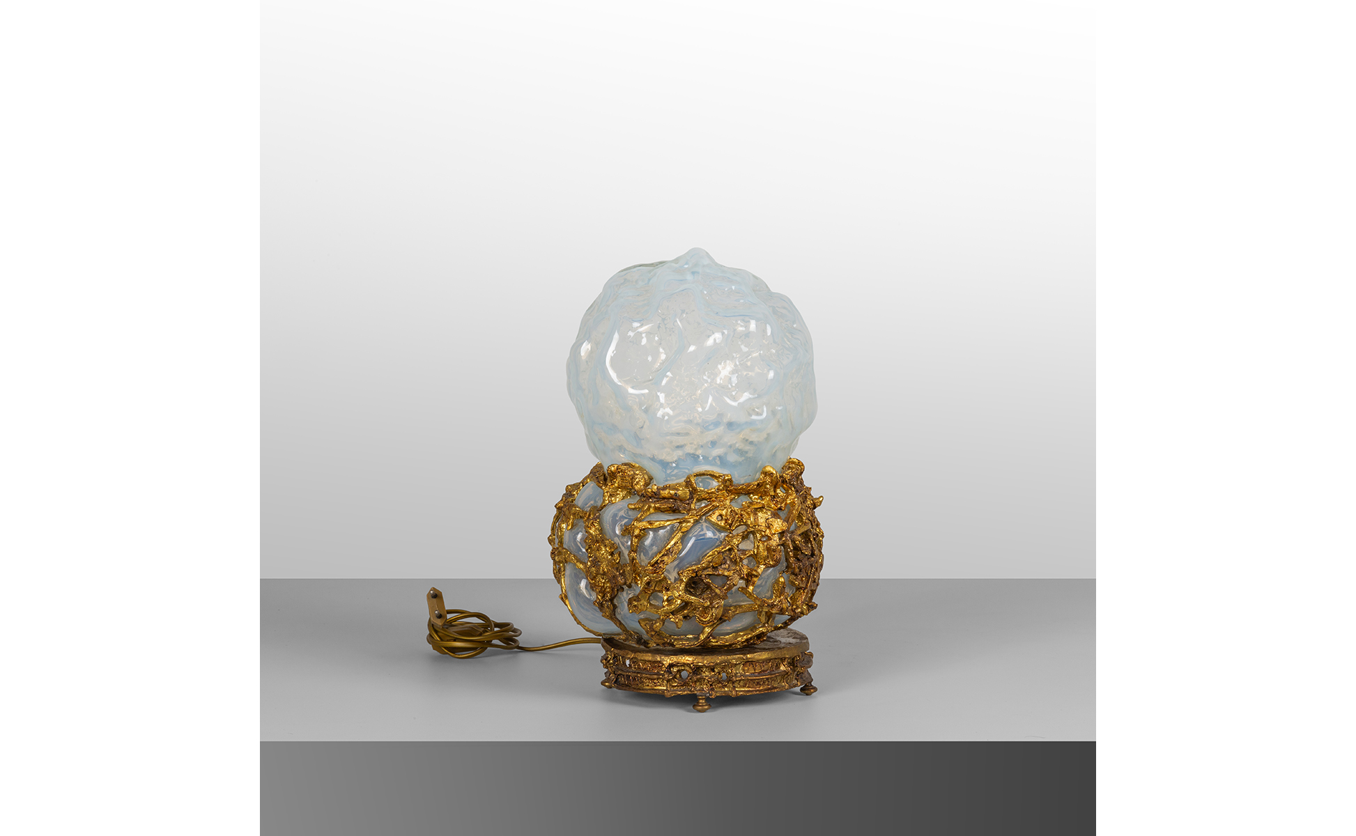 Fusione di ottone cristallo iridescente soffiato ingabbiato.