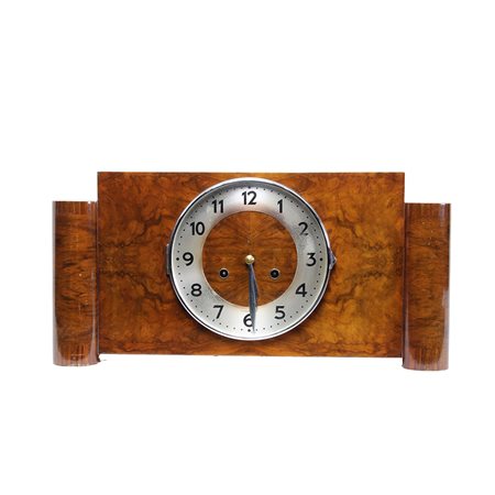 OROLOGIO D'APPOGGIO con cassa in legno in radica di noce JUNGHANS , da revisionare Svizzera XX secolo h cm 22 x 44 x 15