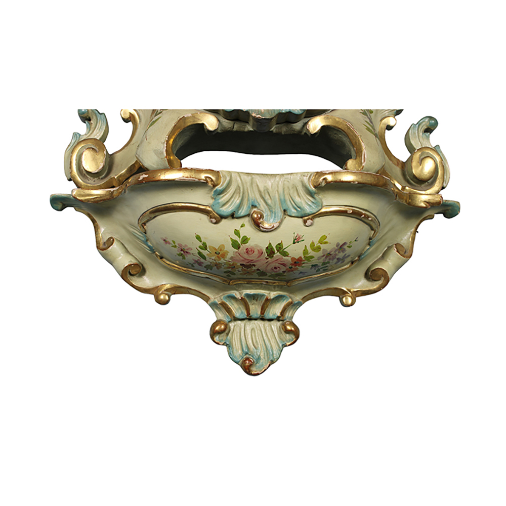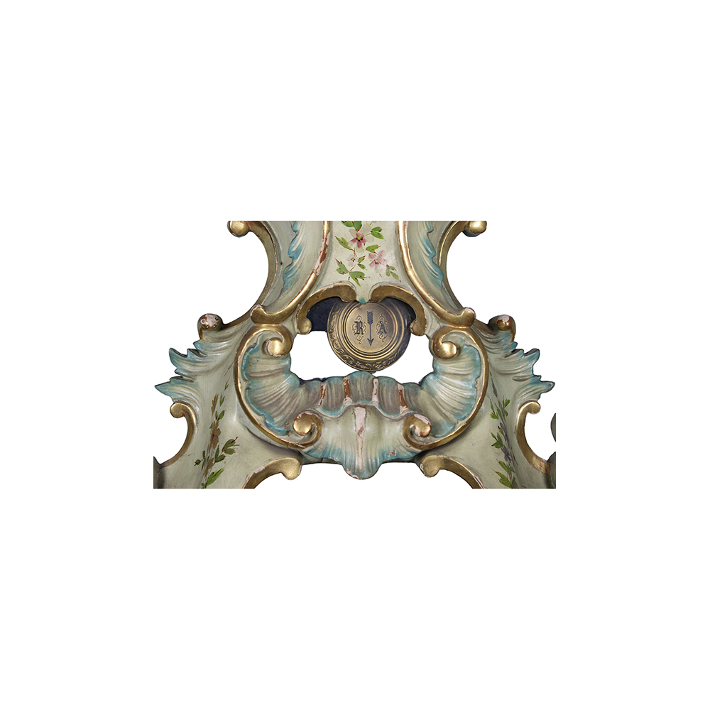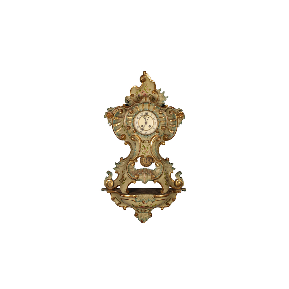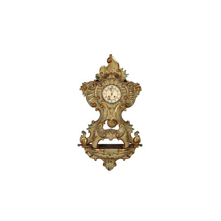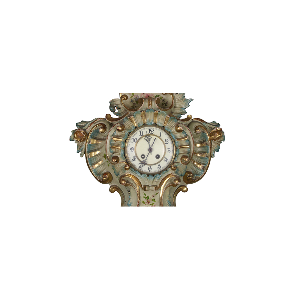 OROLOGIO DA APPOGGIO con mensola in legno laccato e dorato e dipinto a motivi floreali di gusto Luigi XV , da revisionare Italia XIX secolo h cm 94 x 51 x 13