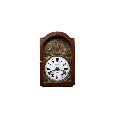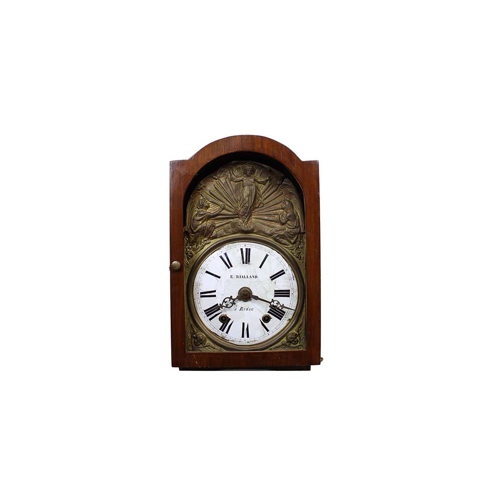 OROLOGIO DA PARETE A PENDOLO a firma RIALAND A REDON con cassa in legno di noce quadrante in ottone sbalzato raffigurante La Resurrezione, da revisionare primi 800 h cm 47 x 30 x 20