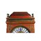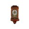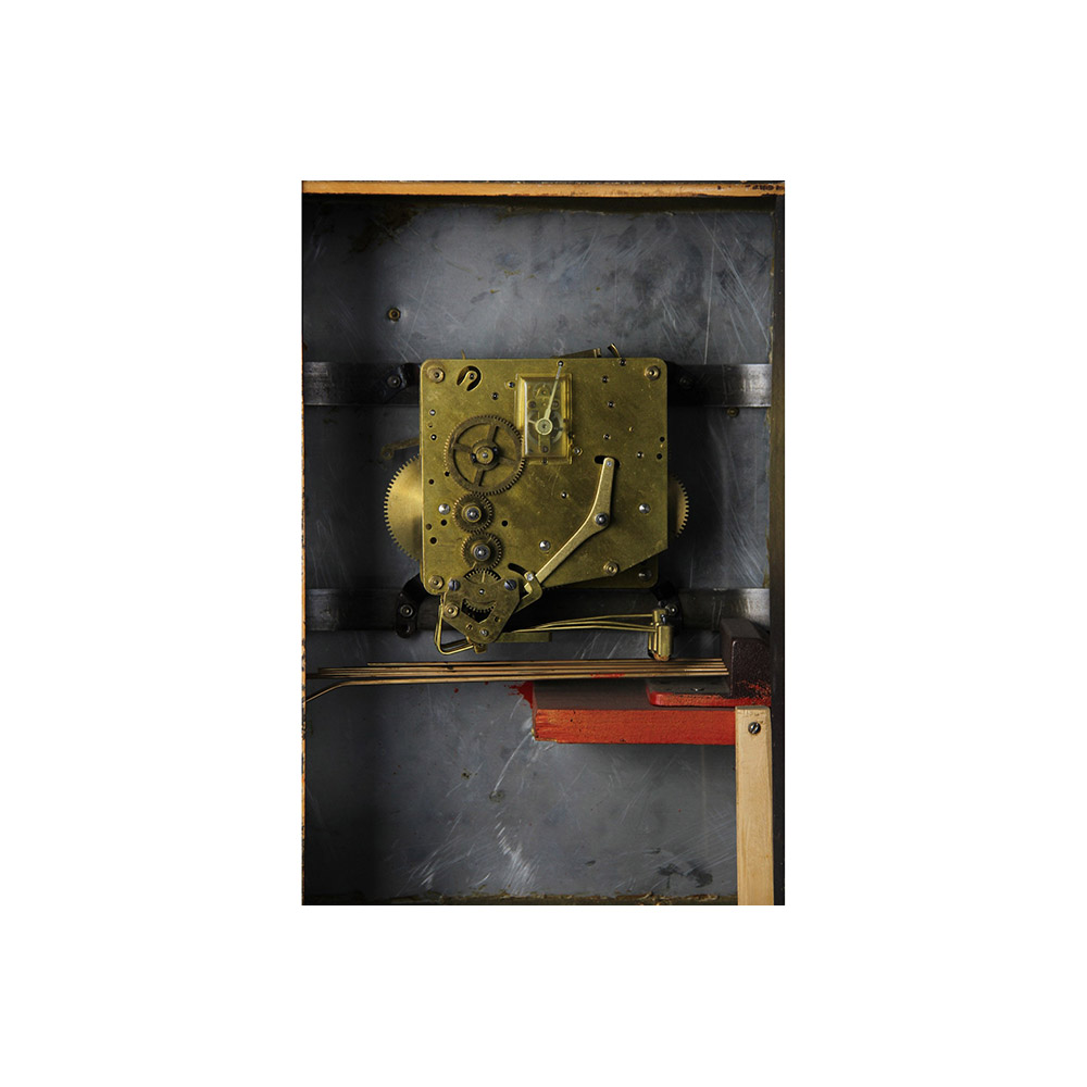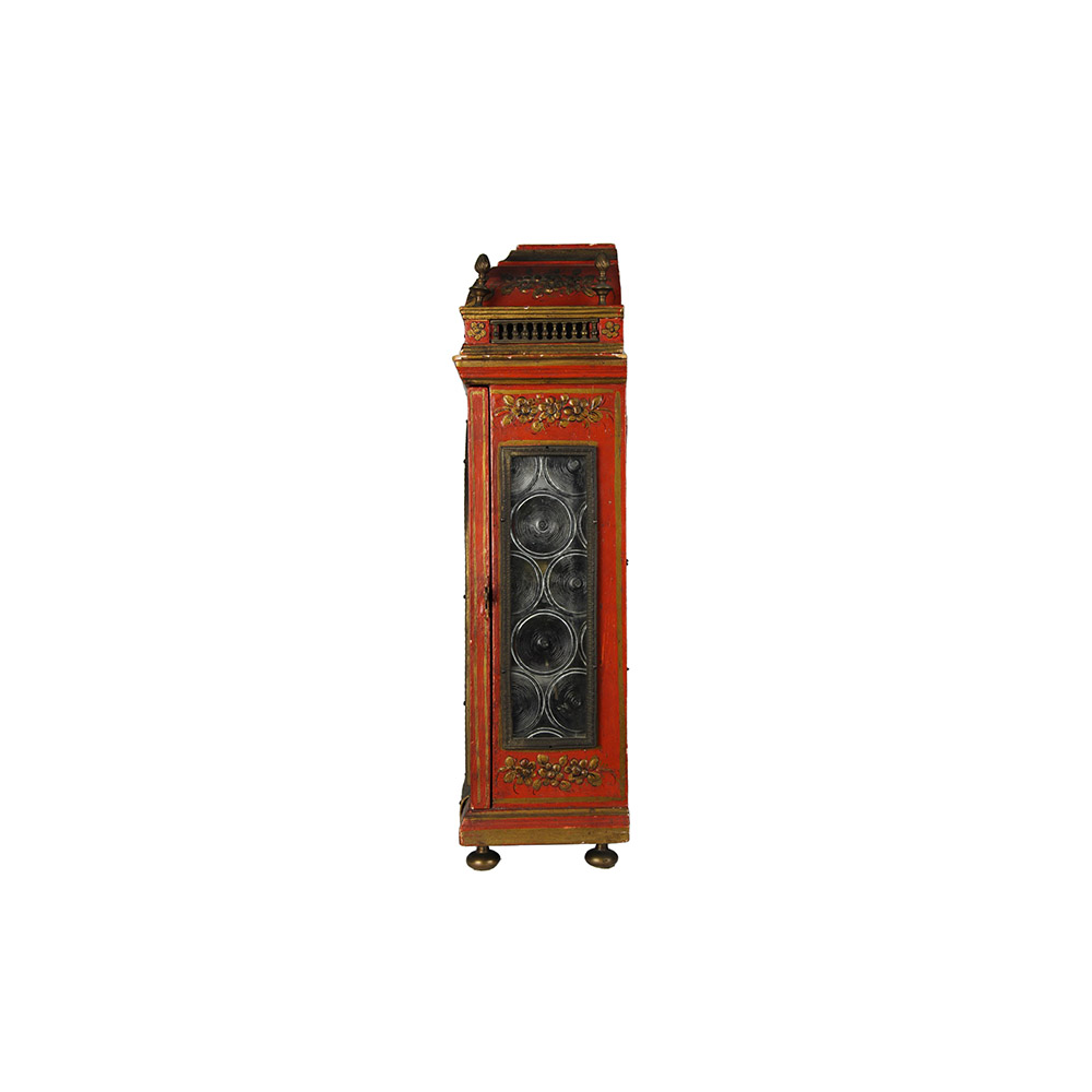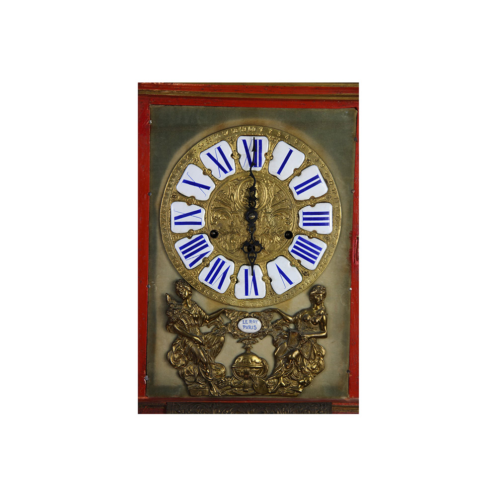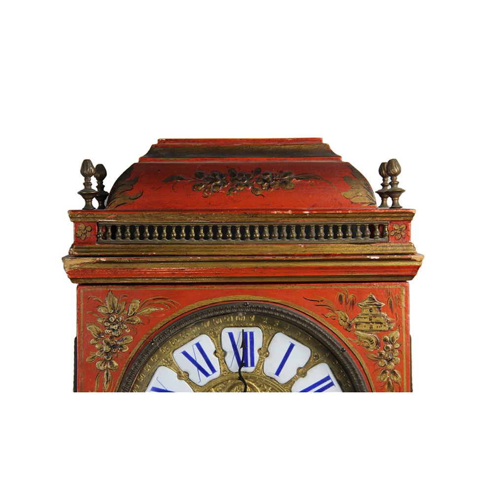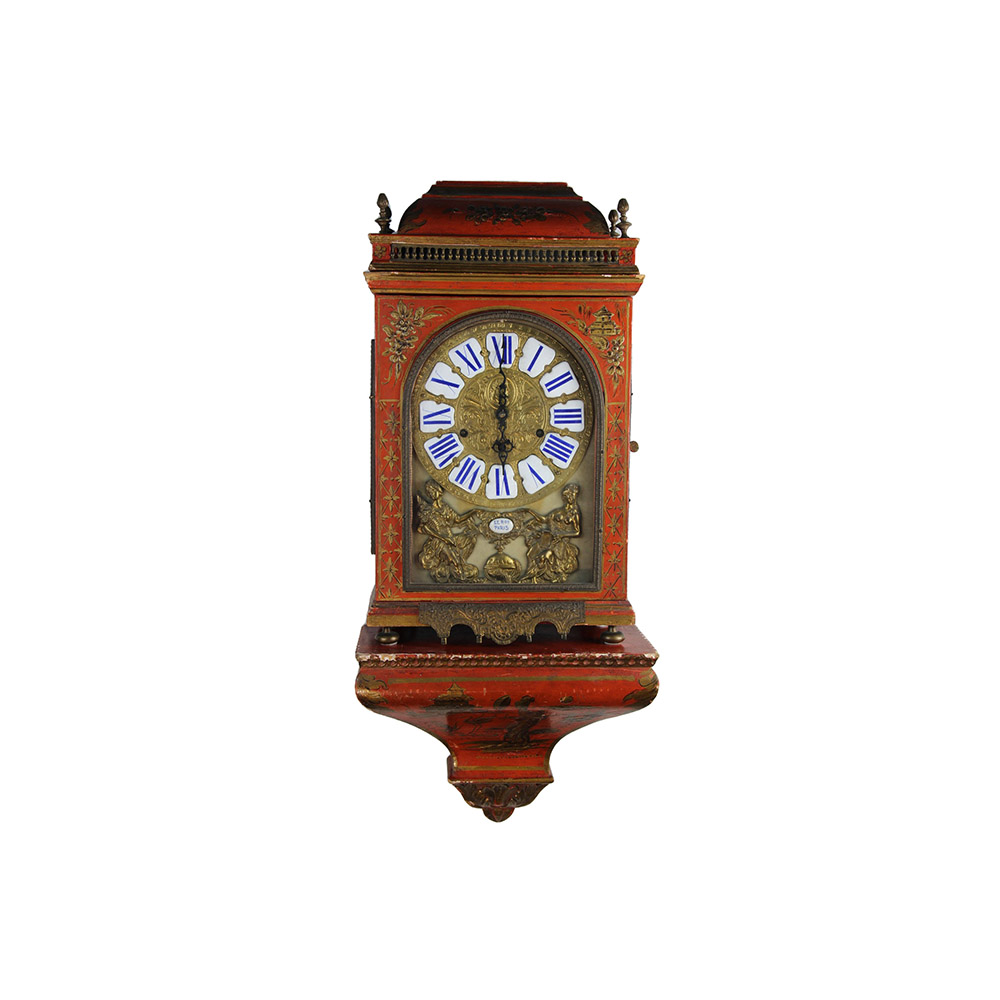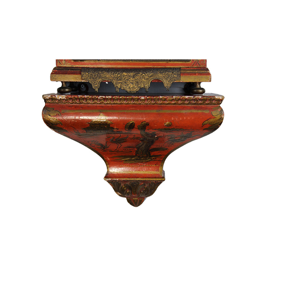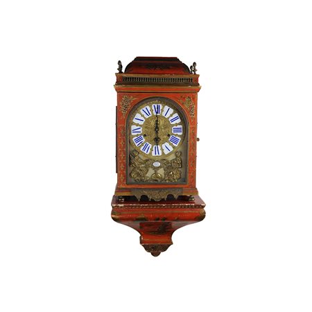 OROLOGIO in lacca rossa in legno decorato da soggetti a cineseria, quadrante sostenuto da figure in bronzo presenta numeri romani su smalto, poggia su mensola pensile , da revisionare Venezia fine 700 h cm 55 x 31 x 15