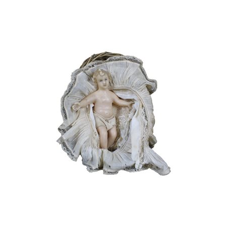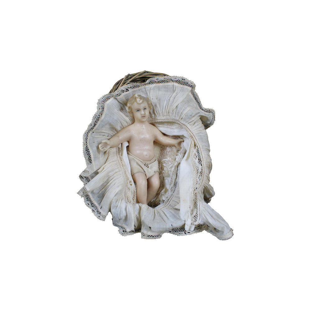 BAMBINELLO in cera con culla in vimini e tessuto Sicilia primi 900 h cm 7 x 14 x 20
