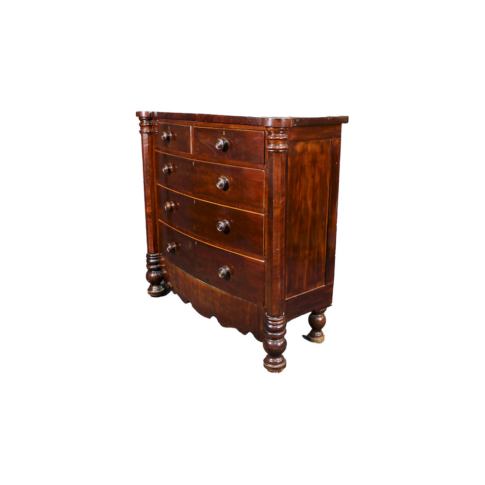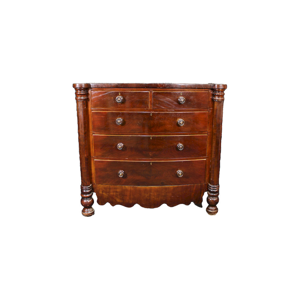 CASSETTONE in mogano a tre cassetti grandi nella parte inferiore e due cassetti nella parte superiore di forma bombata arricchita da colonne ottagonali maestranze napoletane XIX secolo h cm 122 x 130 x 53