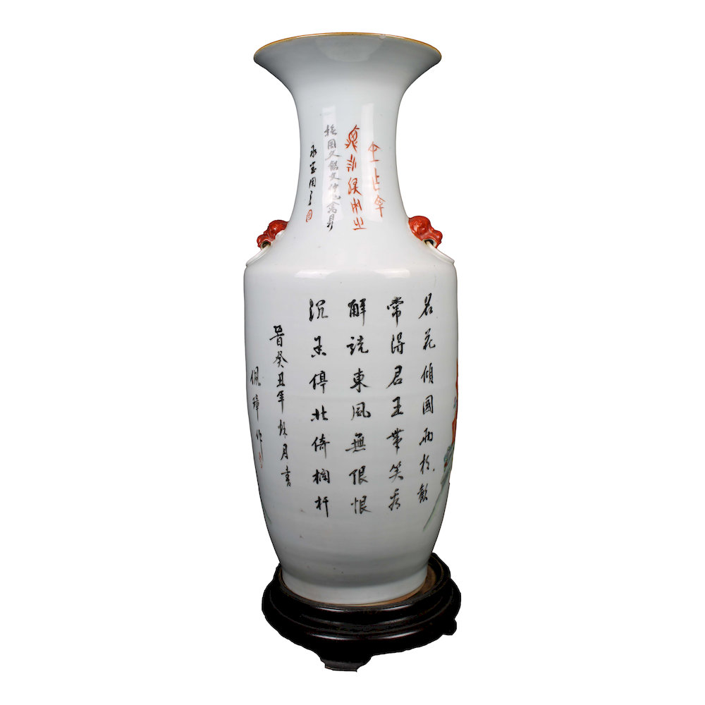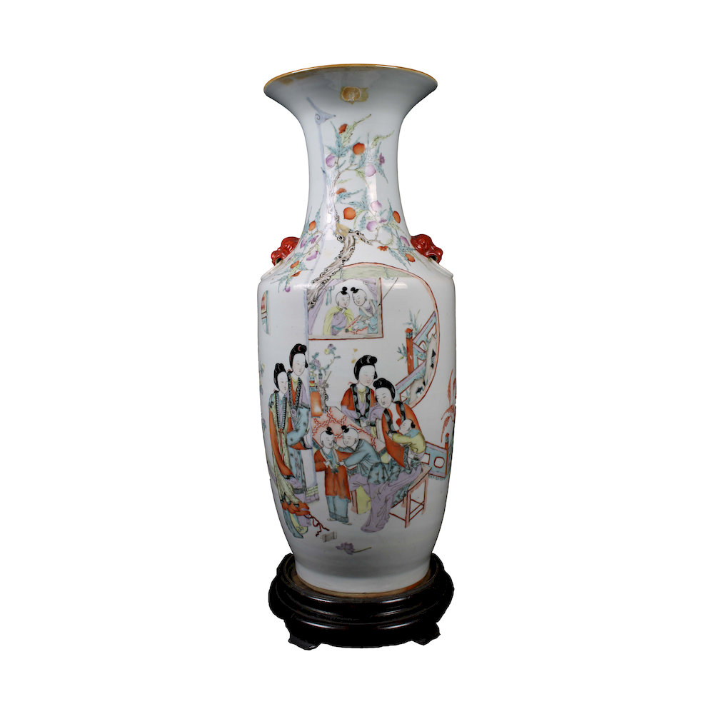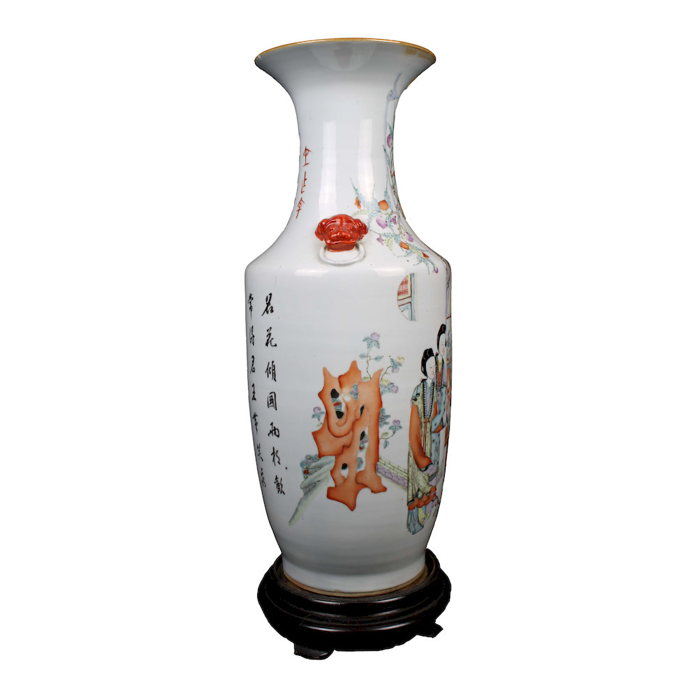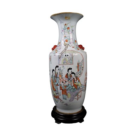 VASO in porcellana policroma dipinto raffigurante personaggi orientali e scritte in cinese Cina XIX/XX secolo h cm 58 x 17