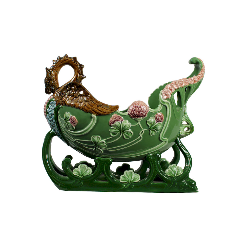 CENTROTAVOLA LIBERTY in porcellana dipinta raffigurante galeone , piccole sbeccature e usure del tempo manifattura Eichwald XX secolo h cm 28 x 39 x 15