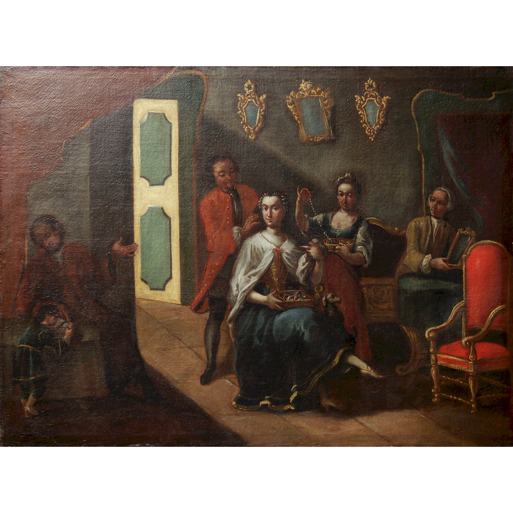 DIPINTO OLIO SU TELA Raffigurante La toletta della nobildonna XVIII secolo scuola napoletana h cm 99 x 135