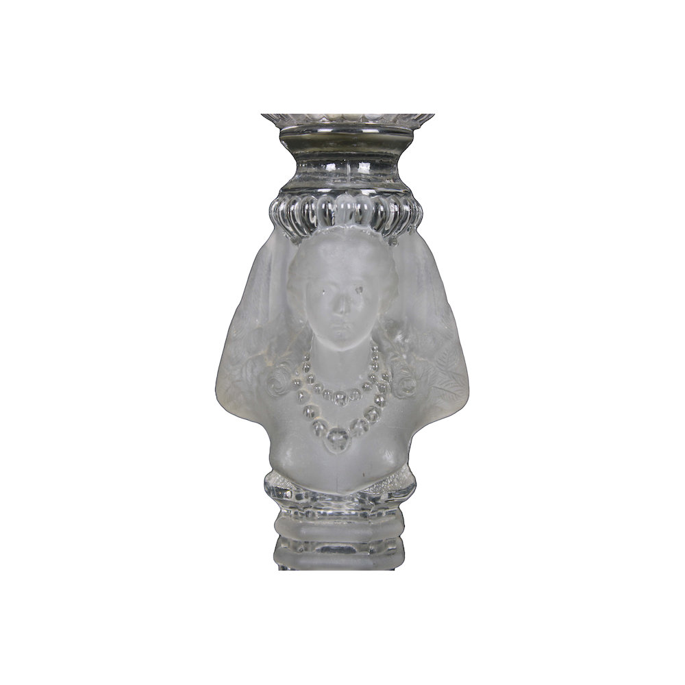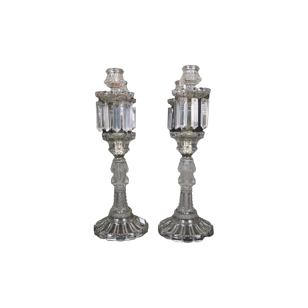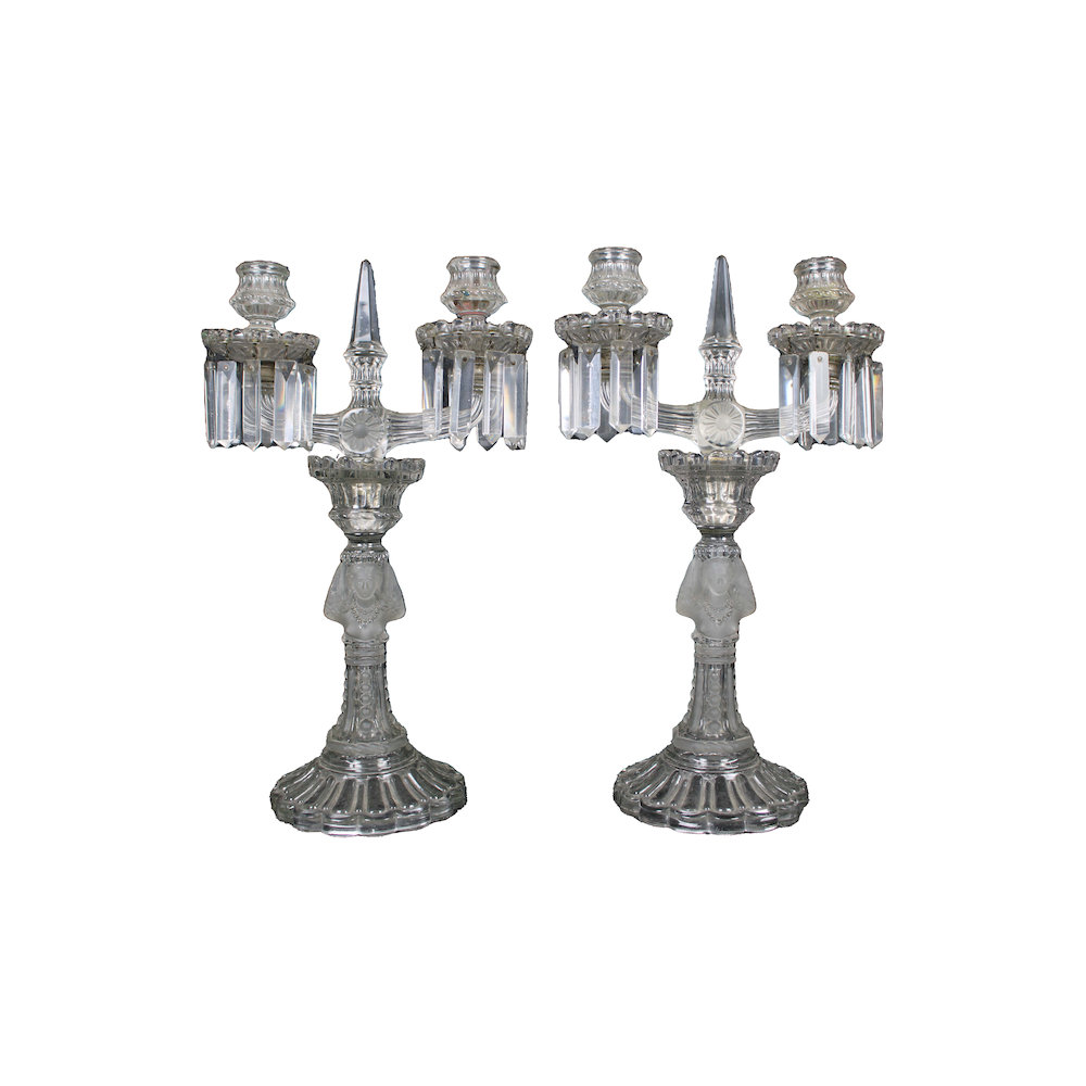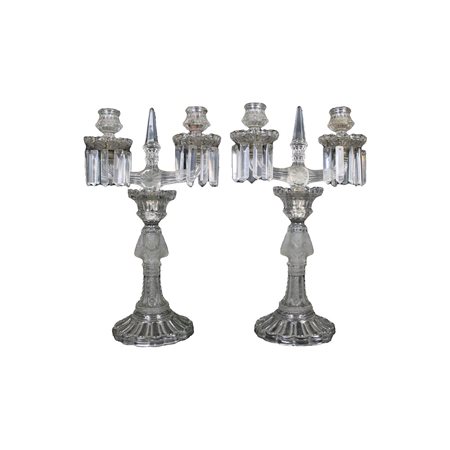 COPPIA CANDELABRI A 2 FIAMME in vetro intagliato raffigurante figure femminili che supportano il moccolo Francia primi 900 h cm 39 x 24 x 14,5