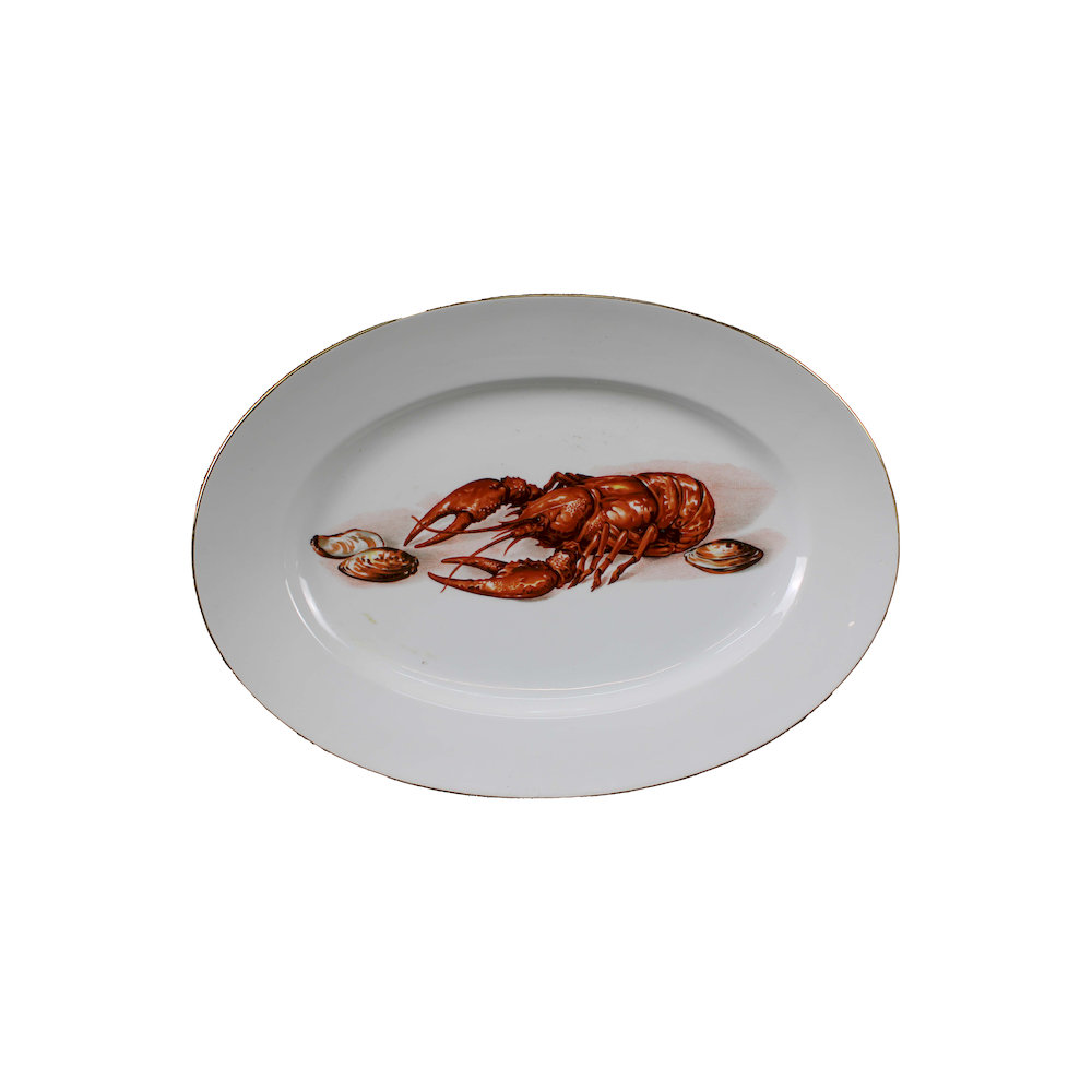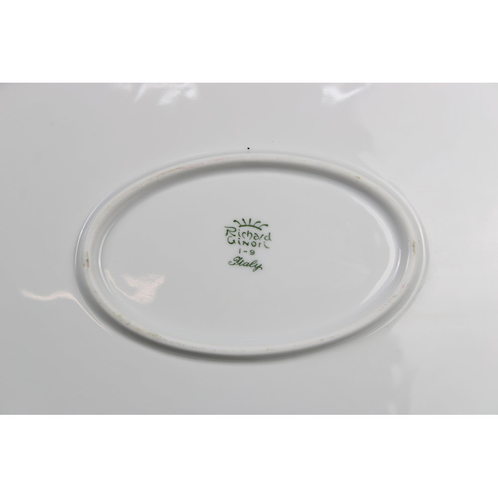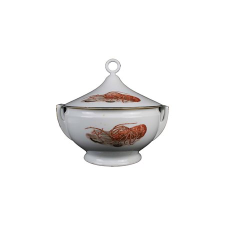 ELEGANTE ZUPPIERA CON COPERCHIO E VASSOIO in porcellana dipinta raffigurante crostacei e lumeggiature in oro manifattura Richard Ginori corredata da mestolo in metallo marchiato Florio Palermo misure varie