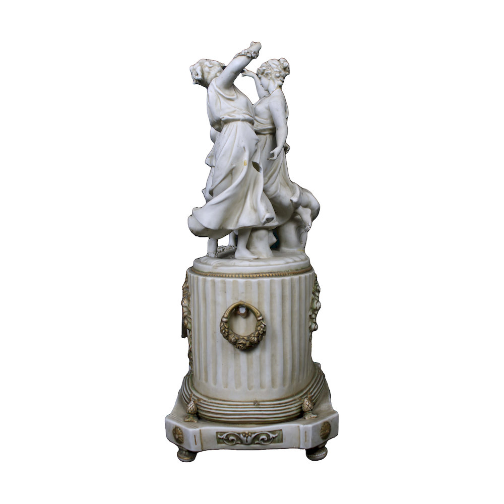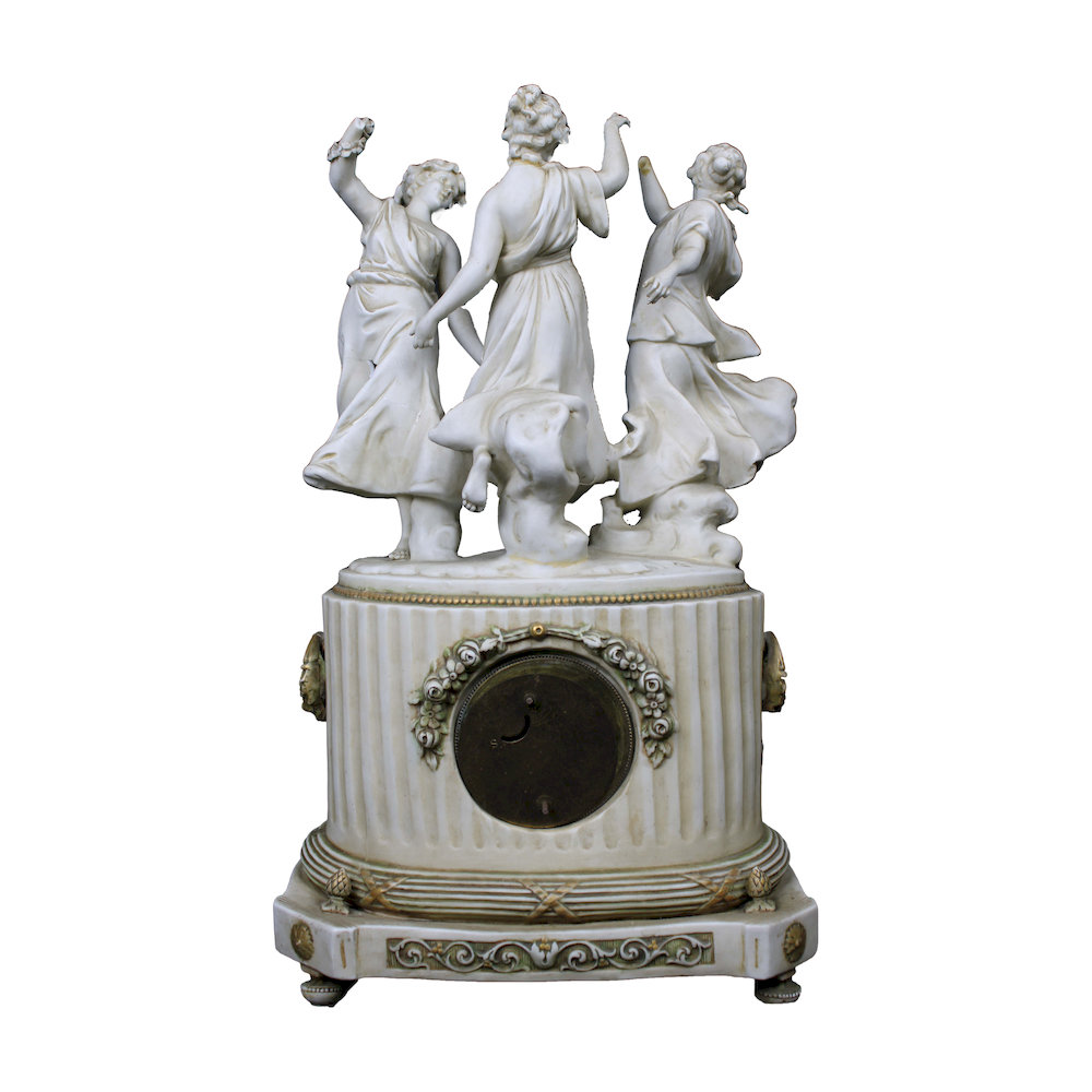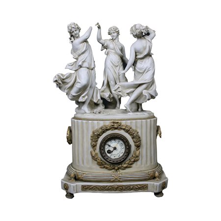 OROLOGIO DA TAVOLO in bisquit lumeggiato in oro raffigurante figure femminili, rotture e mancanze maestranze italiane primi 900 h cm 42 x 24 x 17,5