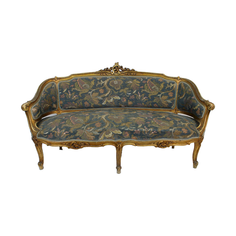 DIVANO in legno scolpito e dorato con seduta imbottita in stoffa maestranze siciliane XIX/XX secolo h cm 85 x 154 x 60