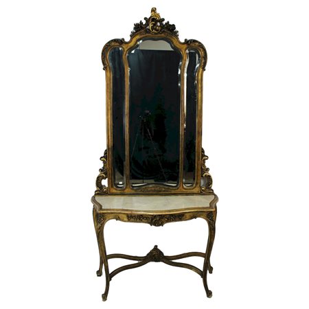 CONSOLLE CON SPECCHIERA in legno scolpito e dorato piano in marmo breccia siciliana maestranze siciliane XIX/XX secolo h cm 271 x 125 x 47