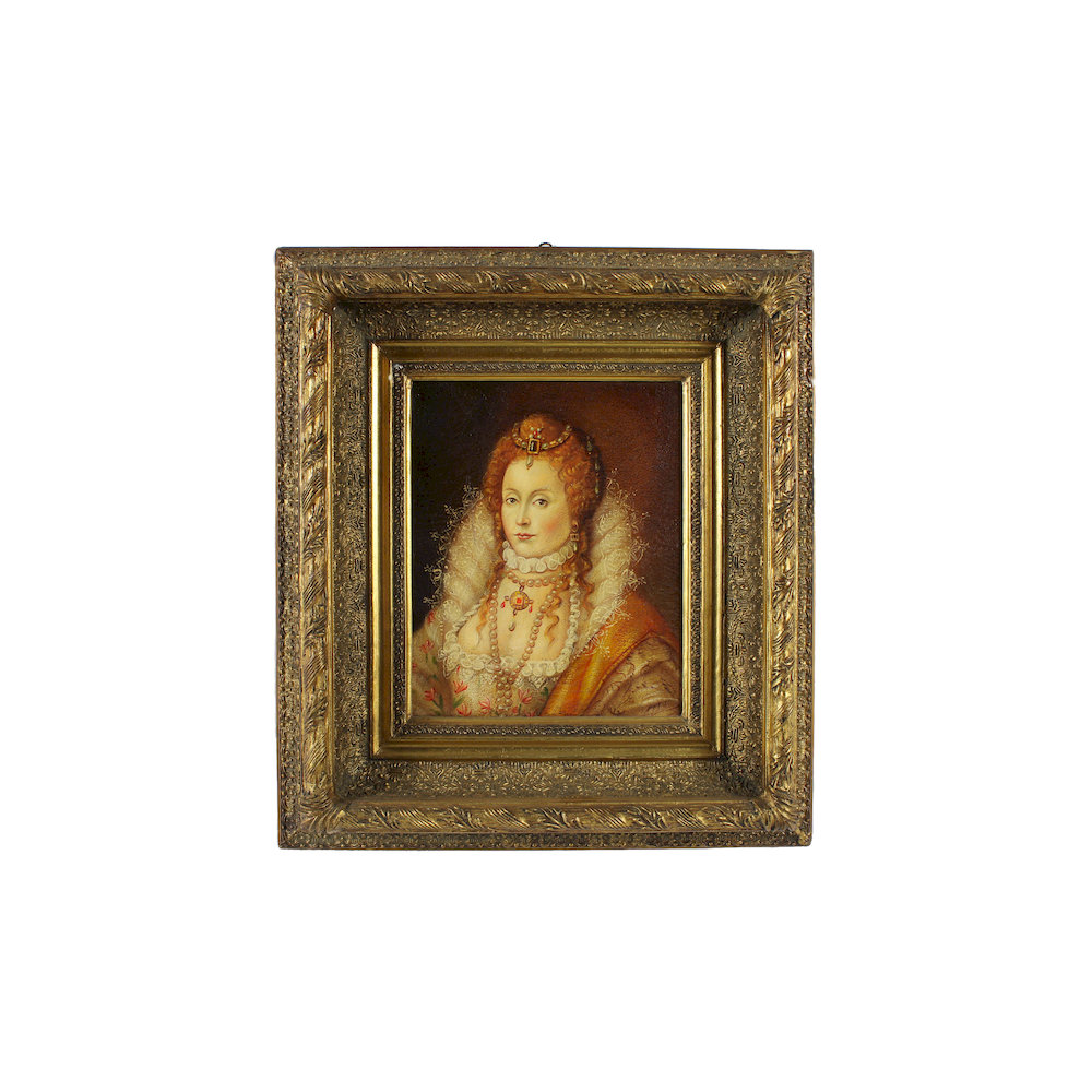 OLIO SU TELA raffigurante Elisabetta I di Inghilterra dentro cornice in legno e pastiglia dorata copia d'autore XX secolo h cm 29 x 23 / cornice h cm 49 x 44