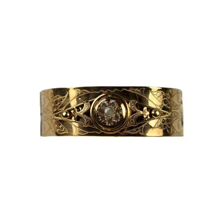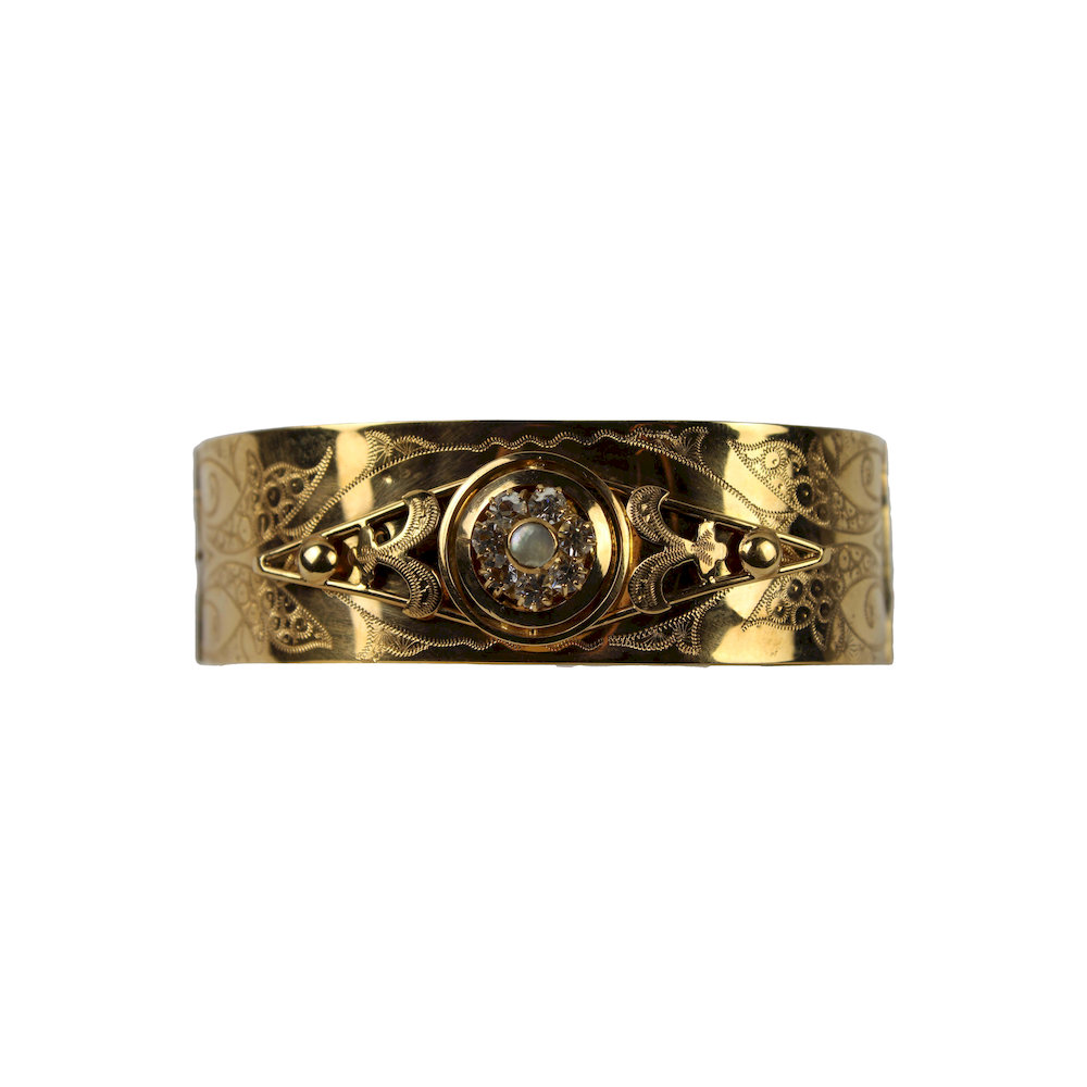 BRACCIALE A SCHIAVA in oro giallo 12 kt cesellato e decorato da pietre prima meta del 900