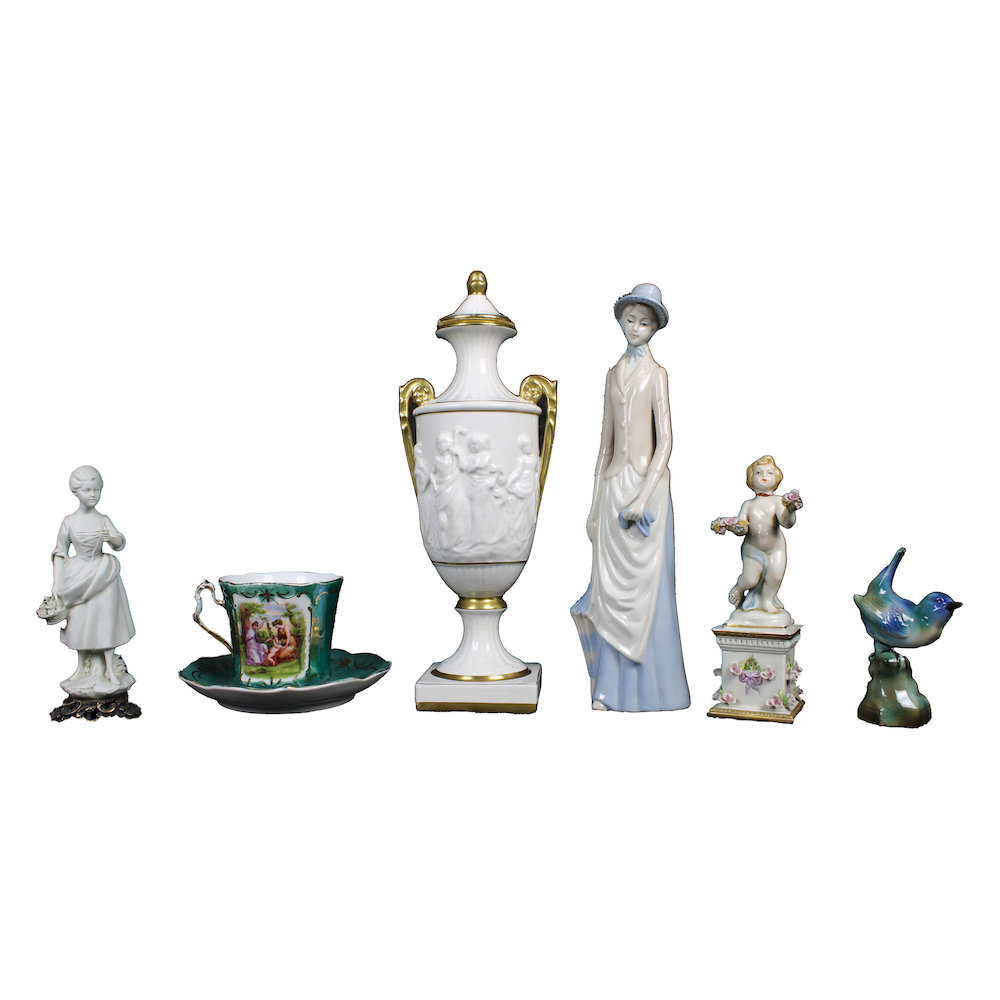 LOTTO COMPOSTO DA 3 sculture raffiguranti figure, 1 vaso, 1 tazza con piattino ed 1 scultura raffigurante uccellino in porcellana diverse manifatture sbeccature e usure del tempo in alcuni oggetti XX secolo misure varie