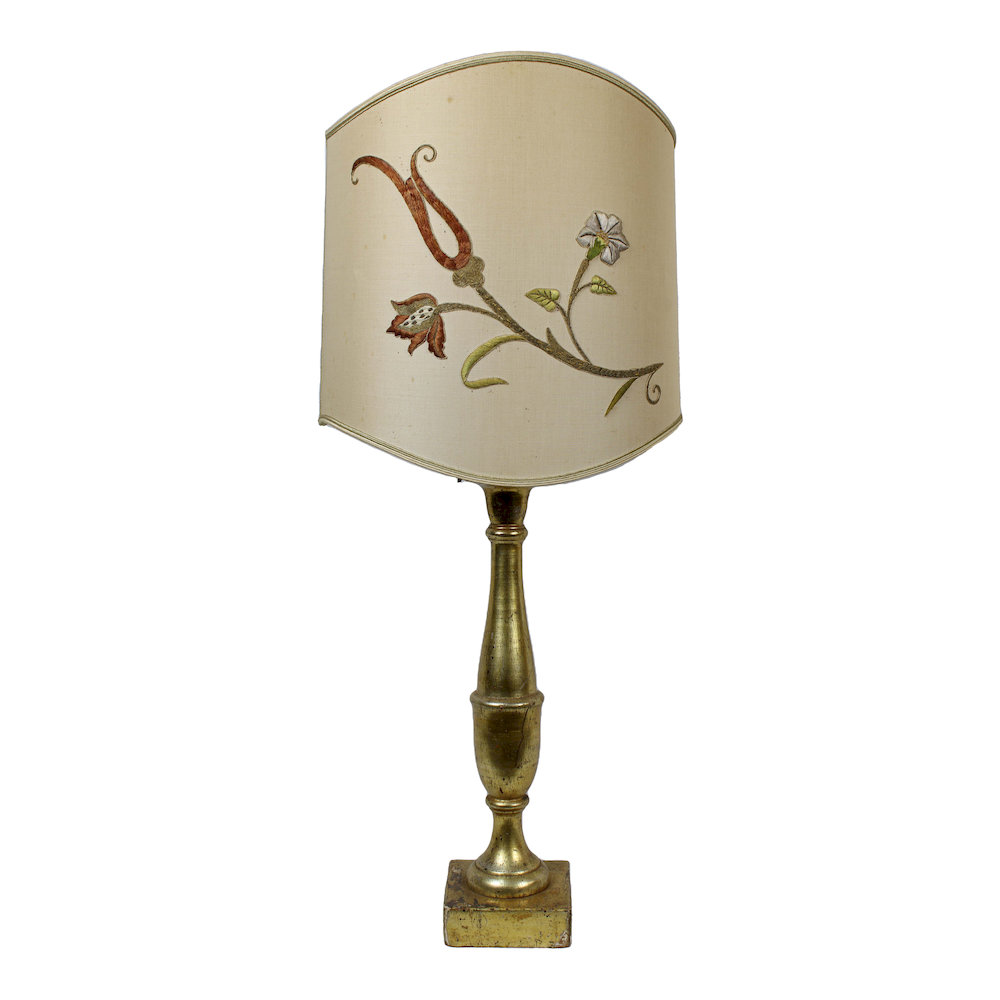 TORCERE in legno tornito e dorato ad argento e mecca montato a lume con paralume in tessuto e ricami Sicilia XIX secolo h cm 81 x 35 x 27