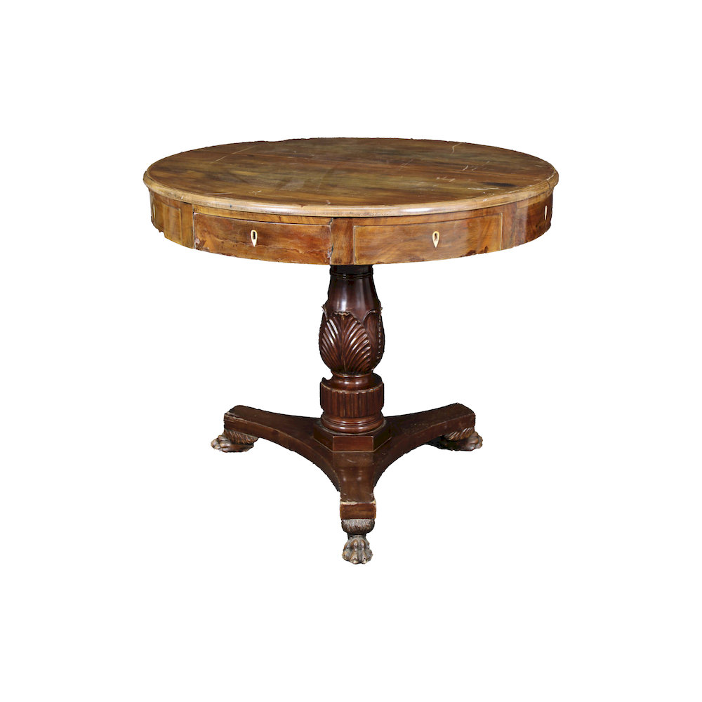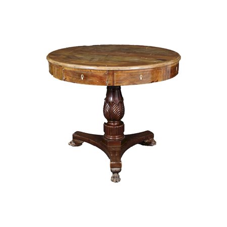 PICCOLO TAVOLO DIRETTORIO in legno di mogano con 4 cassetti gamba tornita e scolpita sorretta da piedi leonini maestranze siciliane primi 800 h cm 78 x Ø 73