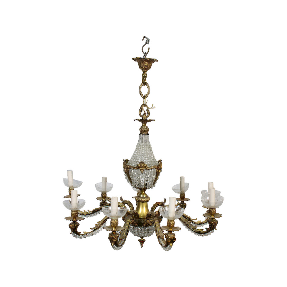 LAMPADARIO in bronzo dorato e sfere sfaccettate in vetro maestranze siciliane primi 900 h cm 107 x 83