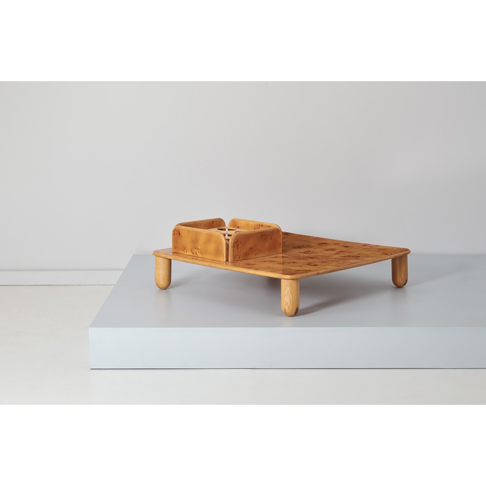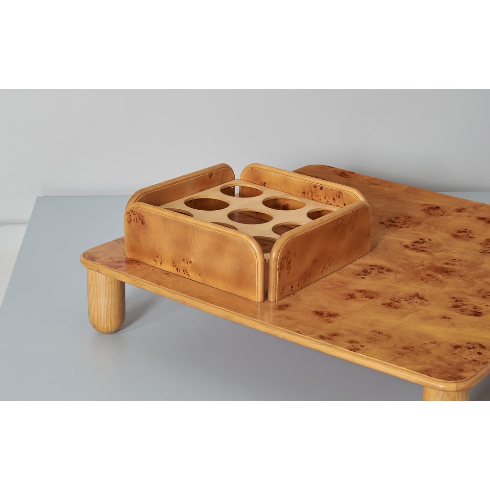 Tavolo basso da salotto in radica di betulla di forma quadrata con portabottiglie.