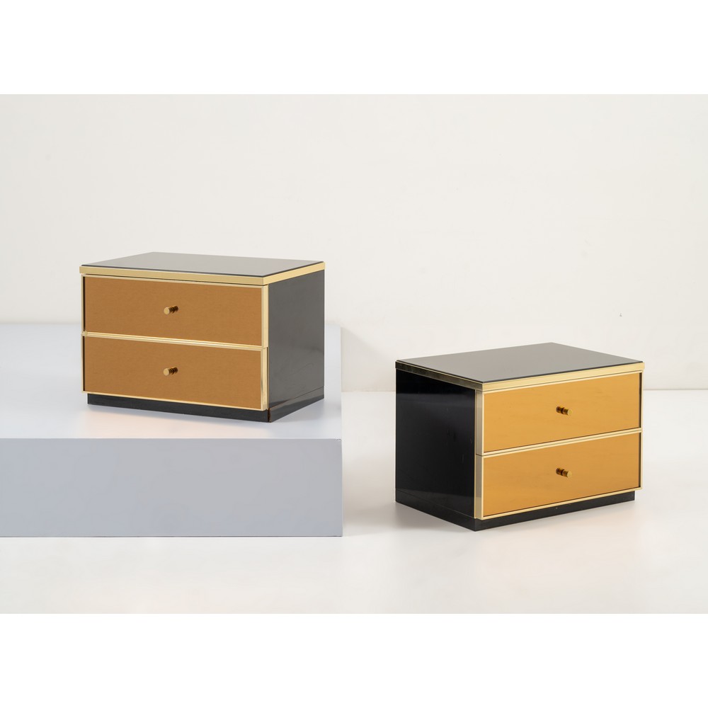 Coppia di comodini in legno laccato nero, fronte con due cassetti rivestiti da specchio fumè e ottone, piano rettangolare in vetro opalino nero.