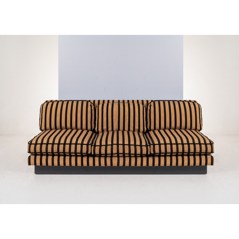 Divano a tre posti con struttura in faggio, imbottitura con rivestimento in tessuto Dedar a righe beige e nero. Base in legno laccato nero.