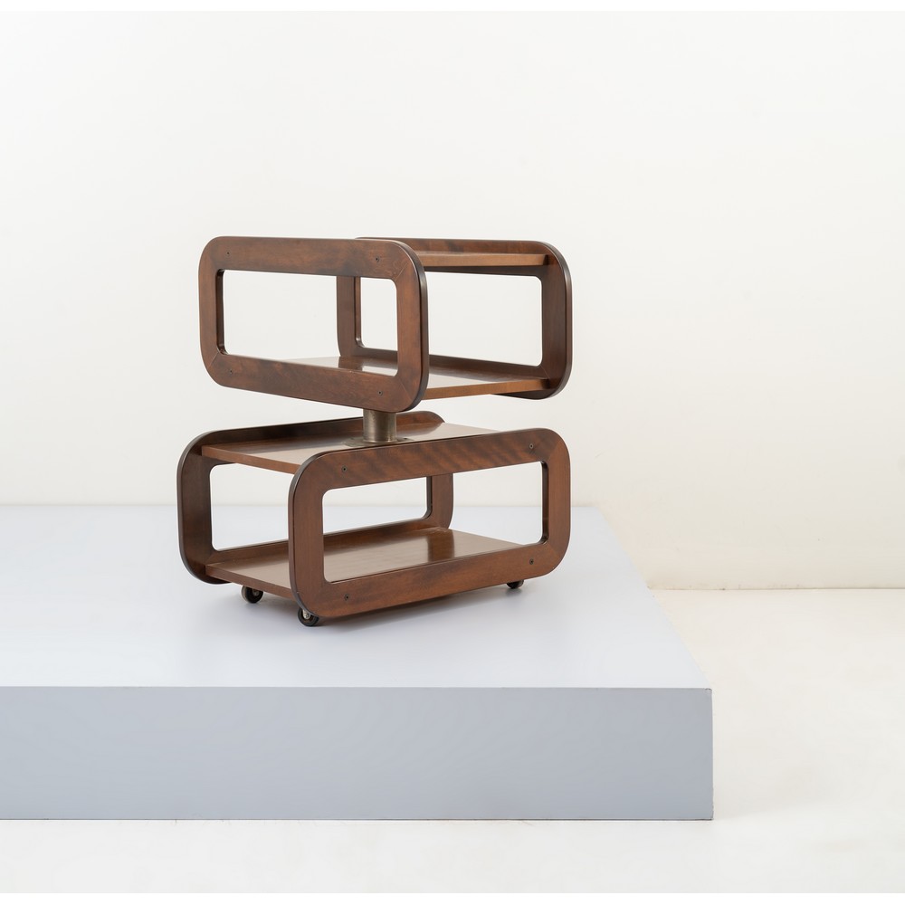 Tavolo rotante su ruote composto da due corpi cavi in legno sagomato, giunto in acciaio, piano e sottopiano rettangolari. Segni di uso.