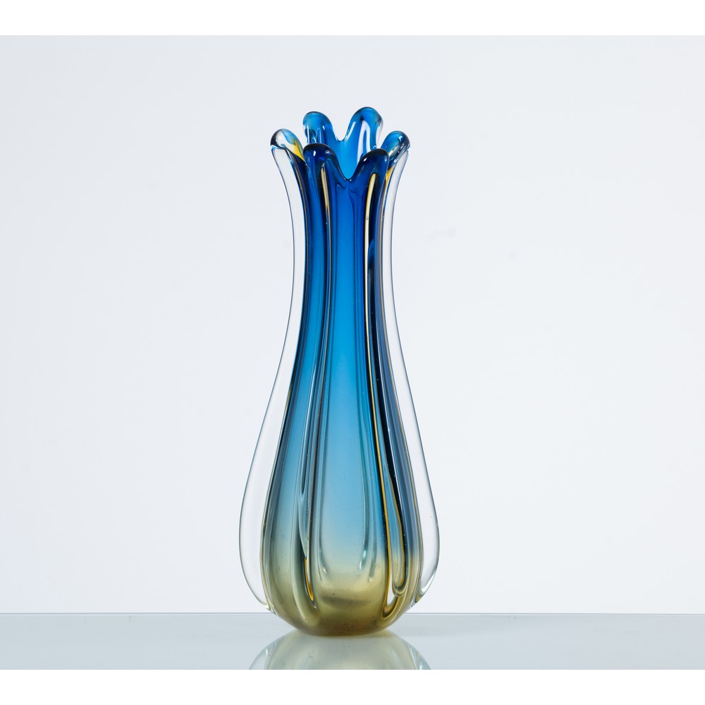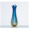 Vaso in vetro sommerso incolore, pagliesco e blu, corpo a goccia con costolature verticali, bocca con bordo ondulato, base circolare.