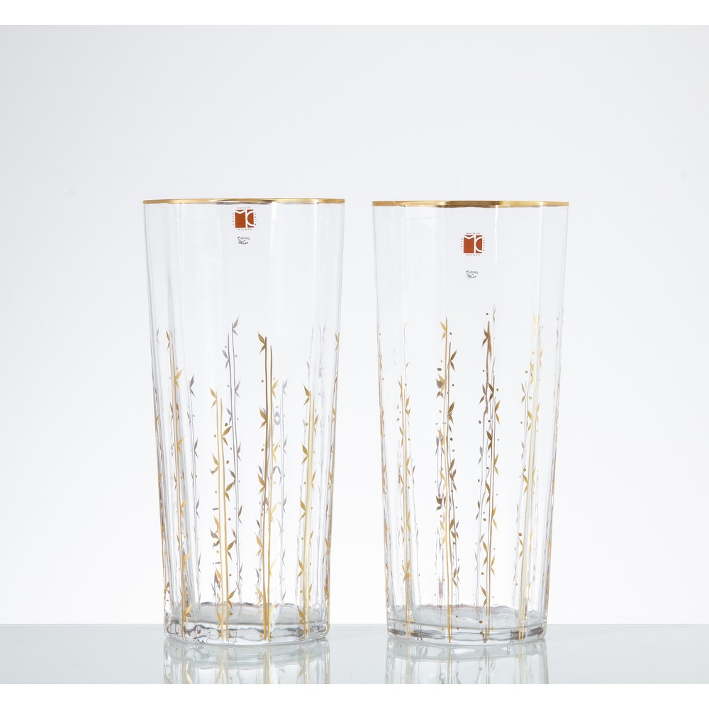Due vasi in vetro soffiato incolore e decorati con canne di bamboo in oro, corpo cilindrico sfaccettato e lievemente strombato, bocca piana bordata in oro. Etichetta di produzione.