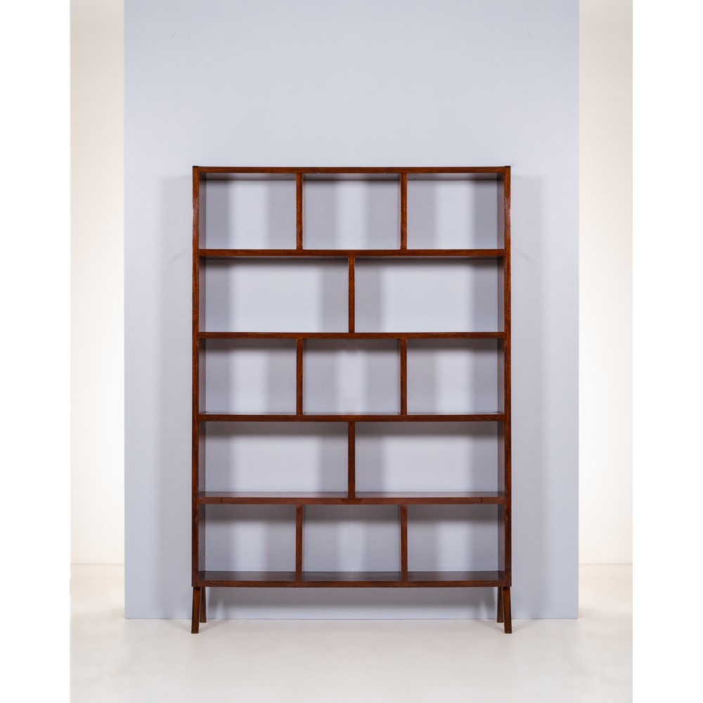 Libreria in legno con cinque ripiani divisi in verticale con vani a giorno.