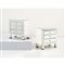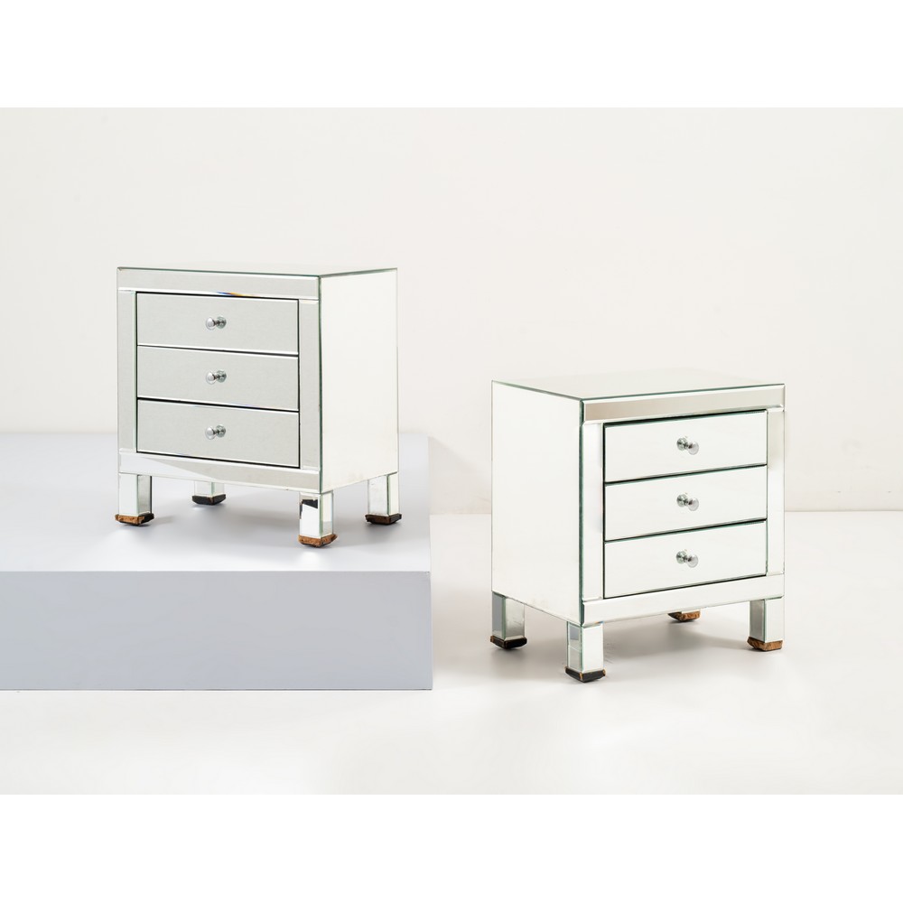 Coppia di piccole cassettiere in struttura in legno interamente rivista da cristalli specchiati, base rettangolare, sul fronte tre cassetti con pomello. Difetti.