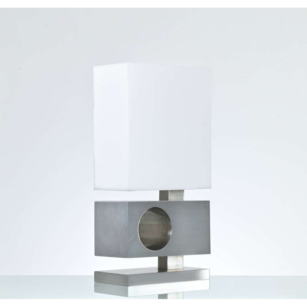 Lampada da tavolo ad una luce, struttura in acciaio spazzolato con cavità laterale, diffusore in plexiglass lattimo.