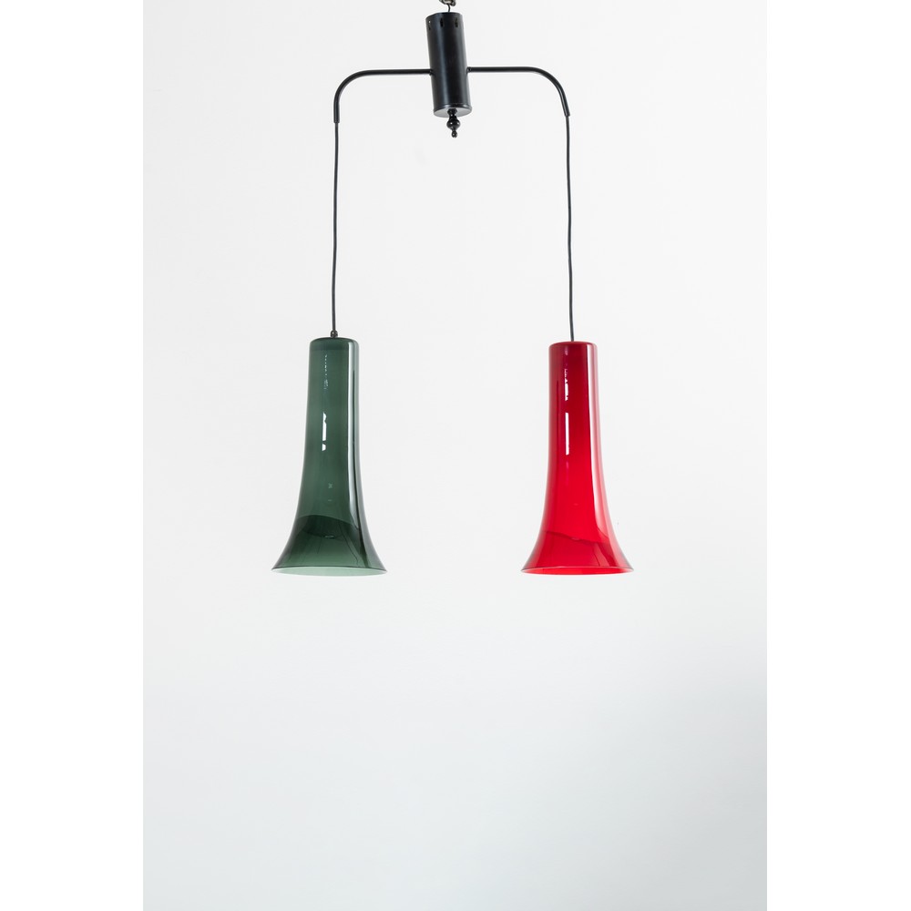 Lampada a sospensione a due luci, struttura in metallo verniciato nero, due diffusori a campana in vetro rosso e verde.