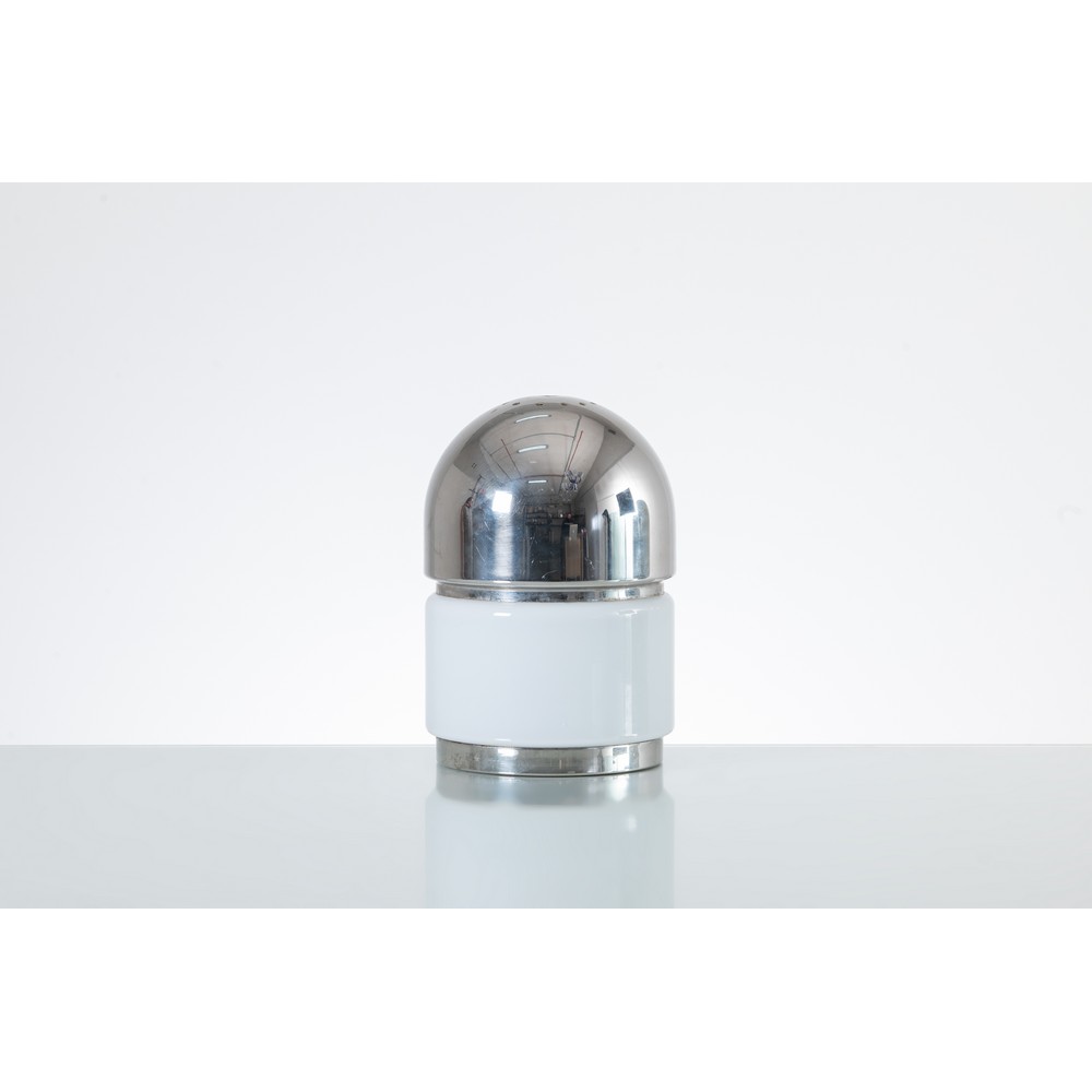 Una lampada da tavolo ad una luce della serie “Sale e Pepe”, corpo cilindrico con diffusore in vetro lattimo e metallo cromato semisferico con forature. Etichetta di produzione.