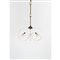 Lampada a sospensione a tre luci in vetro, struttura in ottone, bracci curvati, diffusore a campanula in vetro costolato incolore, catenella in pastiglie di vetro con piccola campanula pendente.