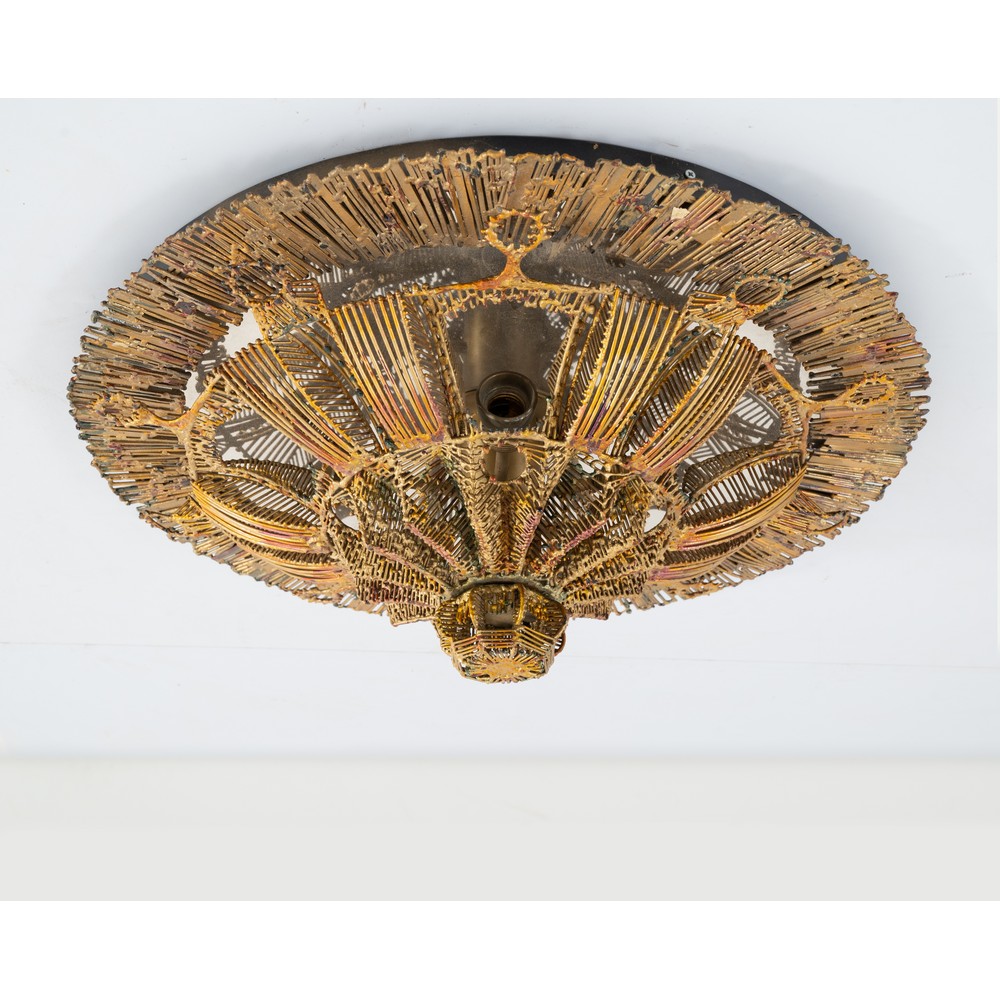 Lampada da soffitto a cinque luci, corpo circolare con diffusore composto da elementi filiformi in metallo verniciato dorato, metallo specchiato.