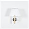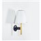 Lampada da parete a due luci, struttura in metallo verniciato nero, braccio in tubolare metallico dorato, diffusore conico tronco in vetro satinato opalino lattimo. Etichetta di produzione.