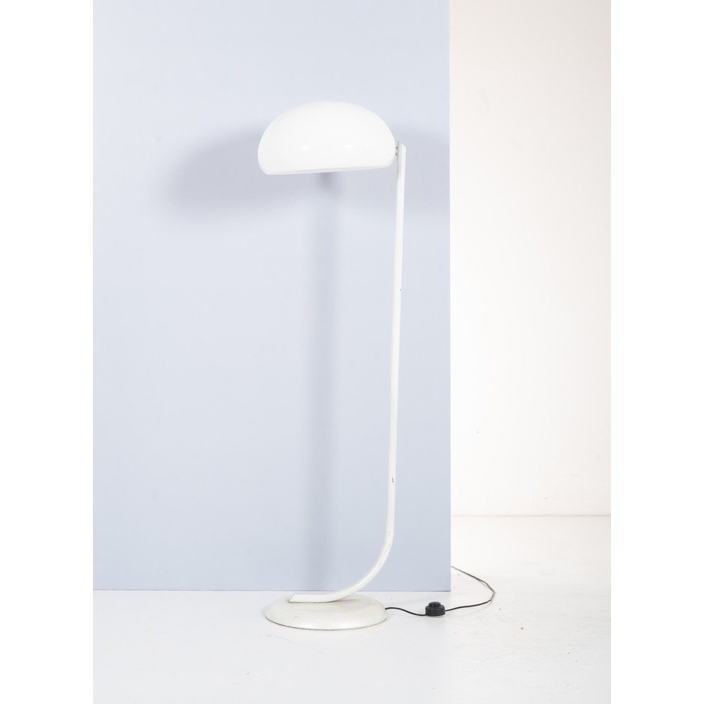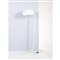 Lampada da terra ad una luce, struttura in tondino metallico verniciato bianco, diffusore semisferico in acrilico bianco, base circolare.