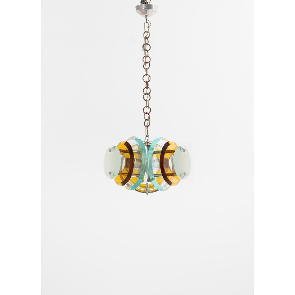 Lampada a sospensione a tre luci con struttura in metallo cromato, diffusore a dischi di vetro a degradare uno trasparente, uno fumè e uno satinato. Lievi ossidazioni.