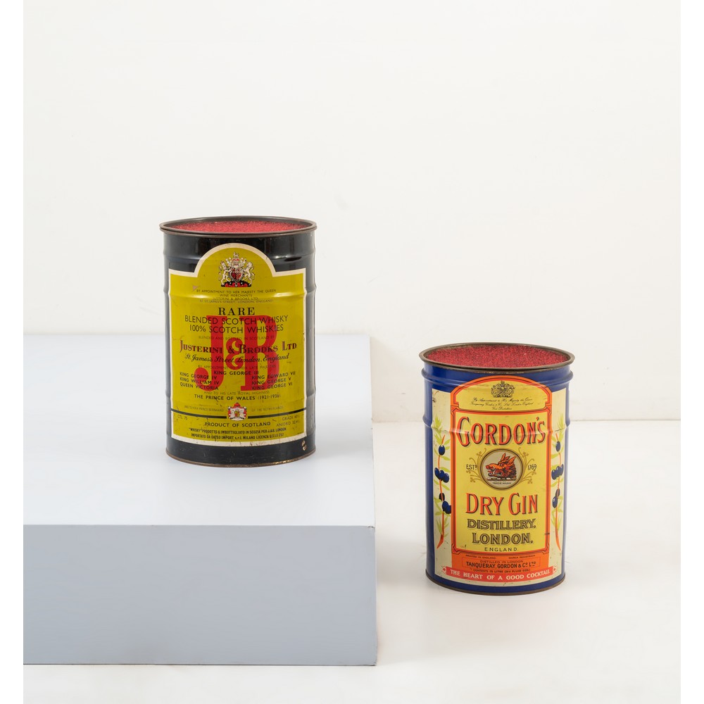 Due sgabelli contenitore pubblicitari in metallo, corpo conico, coperchio amovibile, uno J&B ed uno Gordon's Dry Gin.