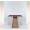 Tavolo con piede in metallo ossidato, corpo troncopiramidale, piano quadrato in ardesia smaltata in superfice nei toni del rosso.