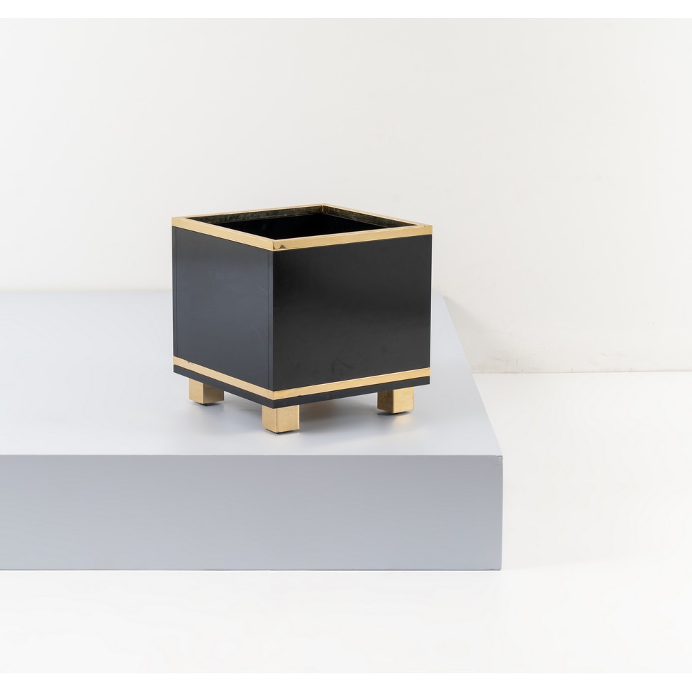 Cachepot in legno e metallo dorato, corpo cubico con piedi dorati. Lievi segni di uso.