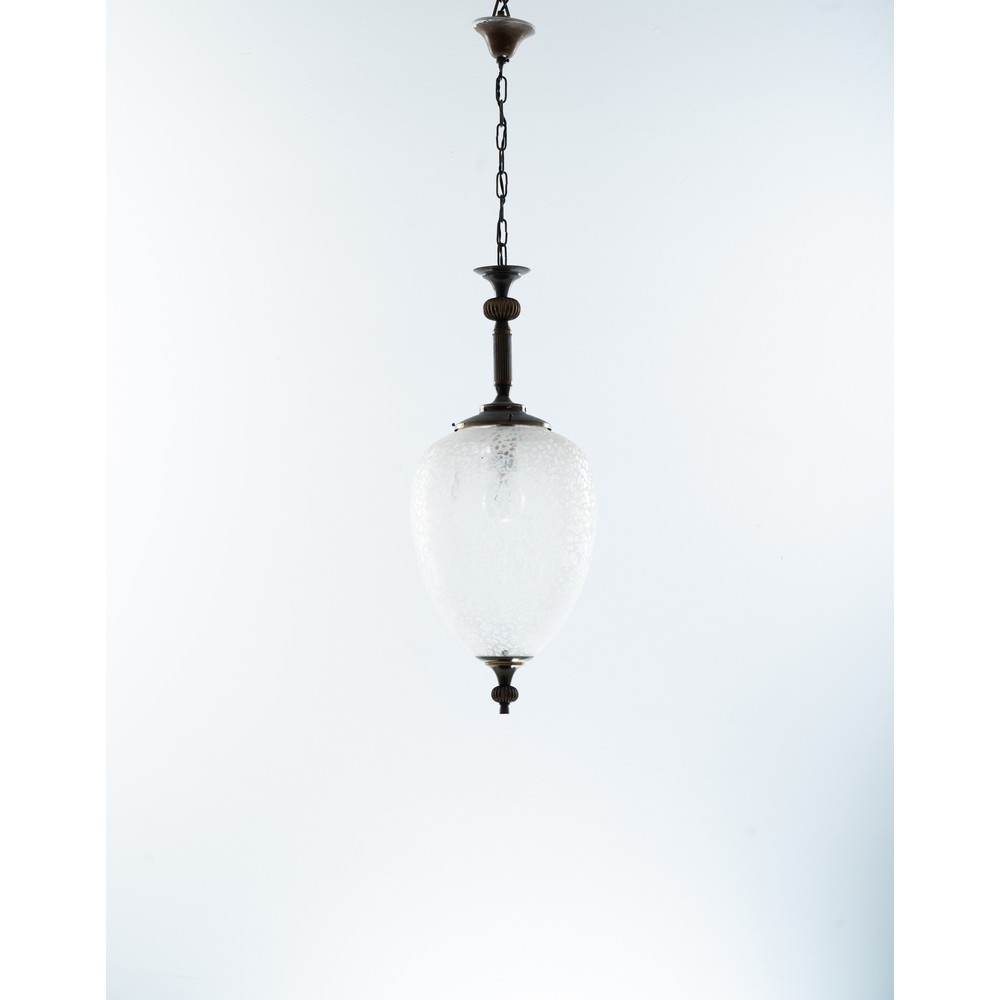 Lampada a sospensione ad una luce, struttura in ottone, diffusore ovalizzato in vetro incolore soffiato e ghiacciato.