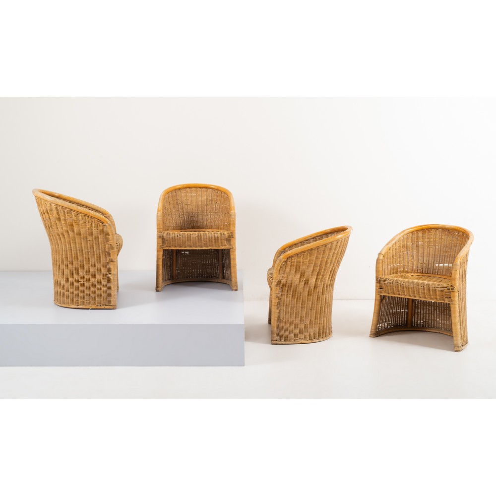 Quattro sedie in bamboo e rattan, spalliera curvata, seduta e spalliera in midollino intrecciato. Usure e difetti.