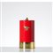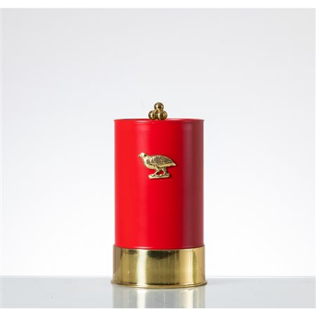 Portaghiaccio in ottone e metallo verniciato rosso, corpo cilindrico decorato sul fronte con figura di quaglia in metallo dorato, chiusura in ottone, presa composto da quattro sfere sovrapposte. Ossidazione all'interno del coperchio. Marchio di produzione.