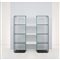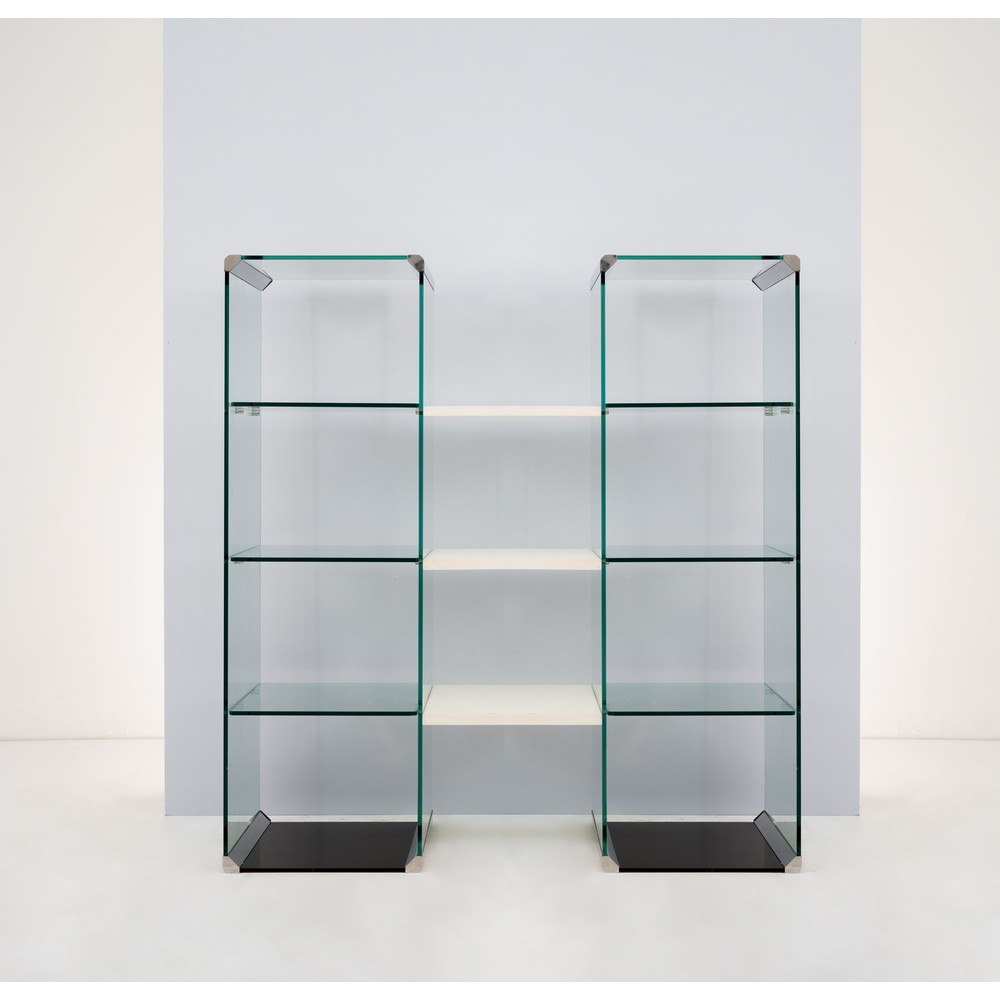 Libreria con struttura in ottone cromato, piani e fianchi in cristallo extra white, base in vetro specchiato fumè, tre mensole centrali in legno laccato.