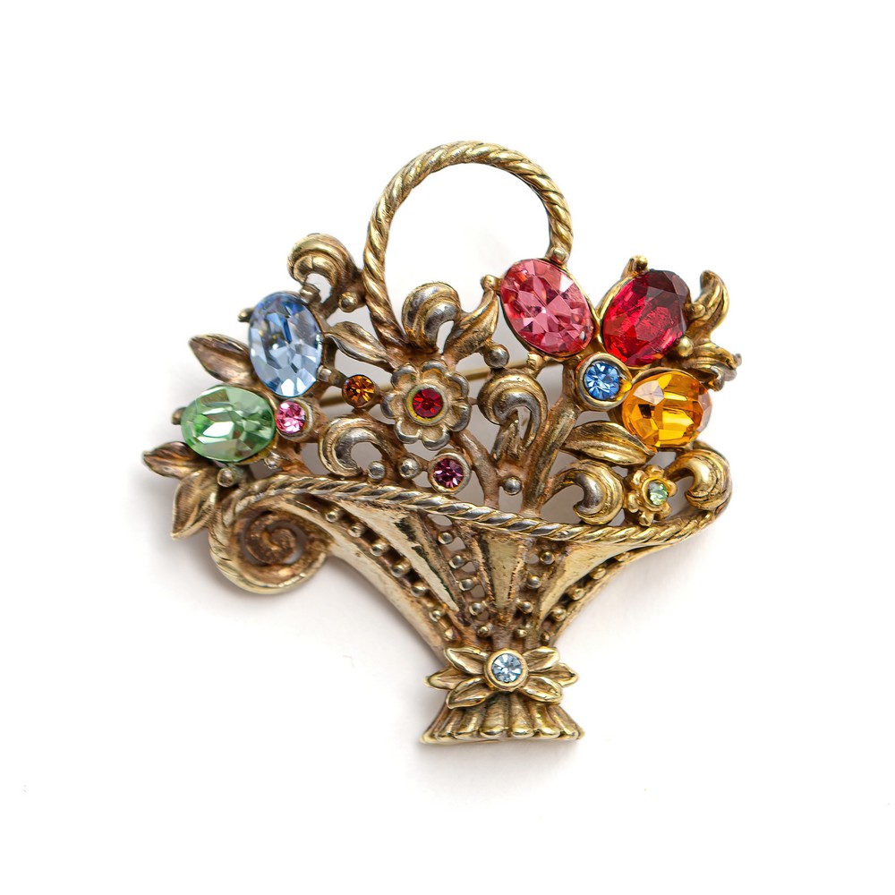 Spilla "Cesto" con montatura in metallo dorato, decori con fiori in cristallo di colori differenti. Marchio di produzione.