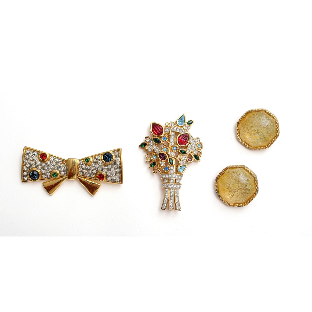 Orecchini con montatura in metallo dorato, bottoni ottagonali cordonati con pietra sintetica gialla. Marchio di produzione. Spilla a fiocco con montatura in metallo dorato, pavè in strass taglio brillante, pietre sintetiche di carature differente color zaffiro, rubino e smeraldo (uno strass mancante). Spilla a tralci floreali con montatura in metallo dorato, diamanti sintetici taglio brillante, pietre con taglio e colore differente.